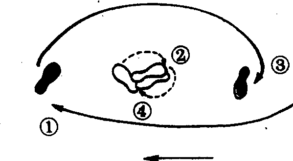 八卦掌步法术语,亦称双换步。指先完成一个单换步后,扣步脚再向摆步脚前扣上一步,摆步脚随上体的继续回转再做一次摆步的单换步组合步法。其足迹路线如图: