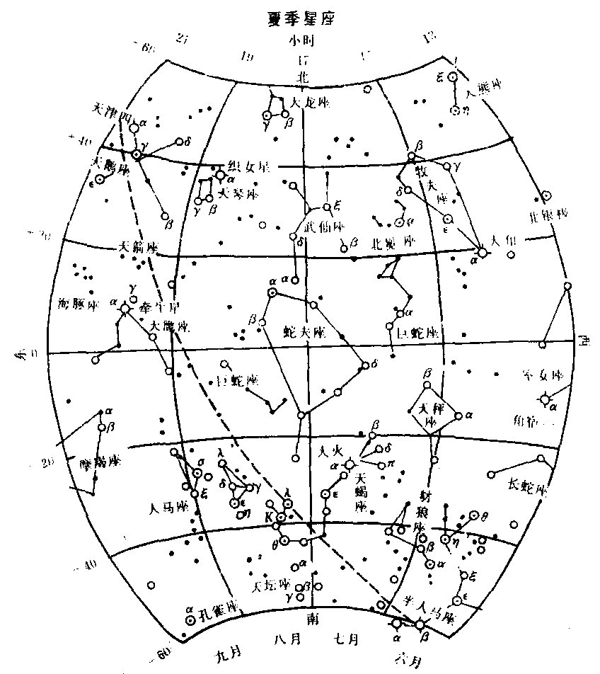 | 释义 | 夏季星空 夏季星空Xia ji xing kong夏季是一年中最好的观星季节,尤其在晴朗无月的夜晚,银河带及其附近的天鹅座,天鹰座,天琴座,天蝎座,人马座等特别引人注目。夏季大熊座北斗七星在西天半空、北斗七星的“斗柄”指向斜上方。美丽的天鹅座,位于银河中,座内最亮的α星是一颗白色的1等星,中名天津四,天鹅座以β为头,δ和ε星为两翼,α星为尾,构成一只伸长颈,张两翼的天鹅,飞翔于银河上。又因它的形状像个十字架,所以也有“北十字”的称号,天鹅座内有亮于4等的星22颗。天鹅座上面是天琴座,位于银河北侧,是北天中纬度主要星座。天琴座α星(织女星)是一颗白色○等星,也是北天最明亮的星,织女星与附近的一些小星排成一个三角形和一个菱形。织女星与地球距离约26.3光年。与天琴座隔河相望的是天鹰座,天鹰座是赤道附近的主要星座之一,位于银河东南侧。中心位置在赤经19时40分,赤纬3°。天鹰座α星,中名牵牛星或河鼓二、牛郎星。是一颗白色1等星。牵牛星同两旁间隔均匀的两颗小星γ、β排列成一直线,这就是有名的“牛郎三星”或“扁担星”。牛郎星和天琴座的织女星都是夏季夜空中的主要亮星。由天鹰座顺银河向南,天蝎座位于南天低空,它的范围大,明星众多,中心位置在赤经16时40分,赤纬-36°,是夏季北半球中最引人注目的星座。它的主要亮星组成一只蝎子形状出现在南方天空,其尾部指向东南。它以β和π星为头,α星为心脏,ε、μ、η、θ、λ等星为尾。天蝎座α星,中名“大火”,是一颗1等的火红色亮星,它与东西两侧的2颗星合称‘心宿三星’。天蝎座内有亮于4等的星22颗。天蝎座东面是人马座,人马座的μ、λ、Φ、δ、τ、ξ六星组成类似北斗的形状,我国称之为‘南斗’。人马座是黄道星座中最靠南的一个星座。黄道上最靠近南方的点一冬至点就在人马座内。人马座与天蝎座之间是银河最亮的区域。牧夫座在天顶的西面,牧夫座α星,中名“大角”,是一颗发红的亮星,星座内的几颗亮星组成一个多边形,像一个风筝高悬在空中。