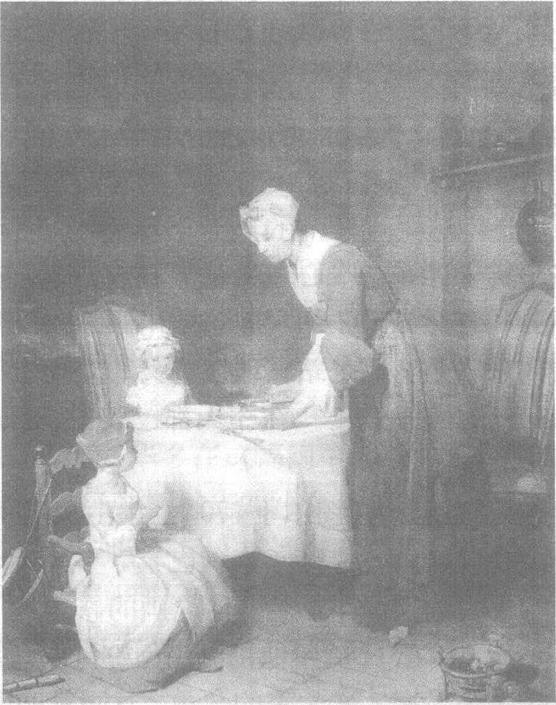 午餐前的祈祷 夏尔丹 在朴素但不简陋的房间里,可以看到软椅完全没有绷丝绸,仅贴着带花道儿的较差的木绵材料; 幼小孩子坐着的椅子,也是普通的木制椅子。挂在椅背上的手鼓和扔在地上的鼓槌,使我们联想到男孩子的性格特点。地上还摆放着简易的火炉,桌上的锡锅中冒着香喷喷的热气。 这是18世纪法国地道的中等家庭生活的写照。它也是夏尔丹作品中广为大家喜爱的 一幅风俗画。 其实,夏尔丹(1699—1779)起初是以画静物画而闻名的。1728年他被接纳为皇家艺术学院院士,就是作为 “描绘动物和果实的画家” 的。他画的静物,除了猎物之外,大都是些厨房里的罐子、水桶之类。夏尔丹认为这些东西多少世纪以来都默默地为人们服务,所以他能从这些平凡的物品中看到一种高贵的品质。大约五年后他才开始转向风俗画。(风俗画这 一绘画种类,无非是描绘那些默默无闻的人们日常司空见惯的事情而已。)自此以后约三十载,他都是在巴黎高雅的中产阶级家庭中寻找题材,画些他们为子女穿衣打扮的事情什么的。他也常以劳工为素材。 如上所说,这幅作品忠实地再现了当时普通市民们的生活,但是另 一方面,它还直接源自于17世纪荷兰风俗画的传统。夏尔丹将17世纪北欧家庭中所熟悉的圣家族餐前祈祷 一类主题,改编成了当时巴黎的现代式的风俗,并塑造出了新的形象。无论是天真的孩子,还是严厉的母亲,在18世纪巴黎的欣赏者们看来,无不有一种直达“我们的日常生活”的感觉。同时,在夏尔丹的画中,每 一片区域,每 一寸间隔和每一种色调都搭配得恰到好处,从没有一个画家像他那样肯定的色彩和构图。 在1744年这幅画的一幅版画复制品中,附有四行诗,从中不难看出,当时人们更是把兴趣放在了这幅画中姐弟心态的精彩刻划上。诗是这样写的: