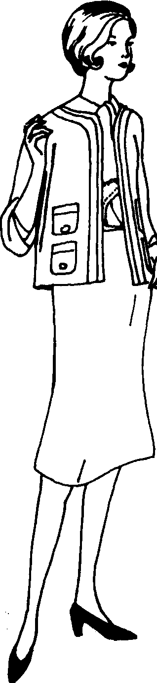 这是穿用范围较为广泛的一种春秋季节套装,它是由衬衫、外套和裙子组合而成的。上衣无领、开身,在前襟、袖口和下摆上缝缀花边或其它装饰品,裙子的前面打有两个褶,加上平易无奇的上衣,显得非常正统,这种朴实无华的风格,正是夏纳尔套装的最大特点。穿着时衬衫的色彩最好选择与外套的色彩形成鲜明反差的颜色,衬衫的领子采用略大一些的,这样便可使整个套装醒目起来,起到画龙点睛的作用。夏纳尔套装的面料适于较为轻快、活泼、优雅的软质布料,如果选用较厚的丝织品或机理效果比较明显的织物,再配上光泽淡雅的丝带,即可成为各种酒会、招待会或办公室的理想服装,也可作为下午礼服穿用。若选择中等薄厚的毛织品,加上毛线手编花边,又可成为日常便装,印花、花格等法兰绒与苏格兰呢的花色面料,也都适用于夏纳尔套装。总之,依照夏纳尔套装的不同面料与不同色彩的搭配,可享有多种变化效果,适于不同场合和年龄层的女士穿用。