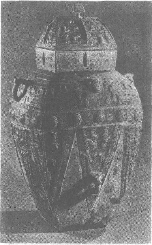 商。盛酒、水器。通高52.7厘米,口纵13.6厘米,口横16.4厘米,腹深40厘米。重16.9公斤。1977年陕西省城固县苏村出土。陕西省洋县文化馆藏。此罍有盖,直颈,长方平底。盖顶设屋宇形把手。盖饰细云纹为地的饕餮纹,颈部的饕餮则为云雷纹组成。肩部的纹饰为两部分,其上部饰弦纹两道,下部饰细云纹为地的夔纹,中间隔牺首,肩两侧有兽首小耳。腹部纹饰亦分为两部分,上部饰涡纹间以细云纹为地的小夔纹,下部饰垂叶夔纹,亦以细云纹为地。下腹一侧有兽首鋬。同坑共出土两件罍,形制大小一样,花纹组合基本一致,当为商代晚期之物。