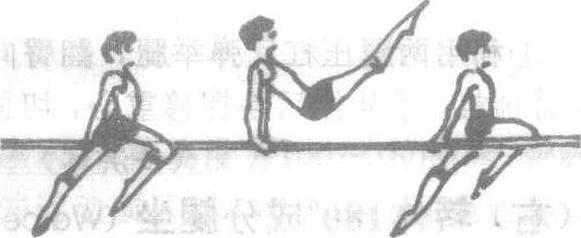 动作要领 由右杠外侧坐姿势开始, 两手体后握杠,肩稍后仰。两腿向左前上方摆起,后腿积极与前腿并拢。同时,借助杠的反弹力使身体腾起,向左侧移重心,两臂用力顶杠,拉开肩角,收腹举腿越过两杠成左杠外侧坐姿势。