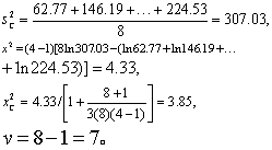 式中ni为各样木含量,其余符号同前。 求得x2C值后,查x2界值表得P值,按所取检验水准作出推断结论。 例1 试检验表1八个方差的齐性。 表1 八个样本的观察值X及其方差