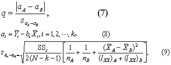 式中下标A、B为相互比较组的组号,下同。 (3)将回归系数由大至小排列,如依次为b4、b3、b2、b1,计算这些回归系数两两之差及其相应的所包含的组数。如比较b4与b3、b3与b2 、b2与b1时,组数为2;比较b4与b2、b3与b1时,组数为3;比较b4与b1时组数为4。 (4) 按式(5)计算q值。