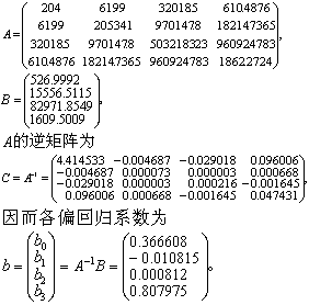 按α=0.05水准,可认为X1、X3与Y有线性关系,而X2没有。 (3)将X2剔除,重新建立新的回归方程。仍用逆矩阵法,系数矩阵A与常数项矩阵B为