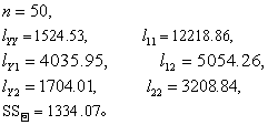 复相关系数的假设检验可用方差分析。式中m为自变量的个数,n为样本含量。如果F≥Fα(v1,v2),则按所取α水准,可认为此多元线性关系成立。注意:由式(7)求得的F值与多元回归方程的线性假设检验所求得的F值相同。 例: 分析某市9岁男孩肺活量(ml)Y,与身高(cm)X1,体重(kg)X2间的关系时,得各个变量的离均差平方和、离均差积和及回归平方和如下。试作多元相关分析。