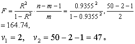 查t界值表,就t1而言,P<0.01,按α=0.05水准,拒绝H0,接受H1,可以认为当体重固定时,身高与肺活量间有正相关;就t2而言,P>0.5,按α=0.05水准,不拒绝H0,即当身高固定时,不能认为体重与肺活量有相关关系。肺活量与体重的偏相关系数rY2·1远小于简单相关系数rY2,这是因为身高与体重呈正相关(r12=0.8072),在rY2中夹杂有X1对Y的影响,以致使rY2不能真实地反映两者间的关系。因此偏相关系数比简单相关系数更能确切地说明变量间的相互关系。 (2)复相关系数的计算及假设检验。 H0: 总体复相关系数为ρ=0。 H1: ρ≠0。α=0.05。 按式(5)