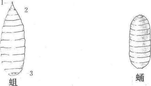 多化性蚕蛆蝇每年发生世代数因地区而异。在热带亚热带发生11~14代,温带6~7代,北温带3~4代。在25~28℃条件下,1个世代约需25~30天。其中卵期1.5~3天,幼虫在5龄蚕体内寄生约4~5天,蛹期10~12天,成虫期6~10天。成虫羽化后多栖息于蚕室附近。取食1~2天后交配。产卵于蚕体表,每次产一粒。多产于5龄蚕腹部第1~2环节及第9~10环节的节间膜或两侧下腹线处(图4)。产卵期持续4~8天,每天以中午为多。每头雌蝇有卵约400粒。