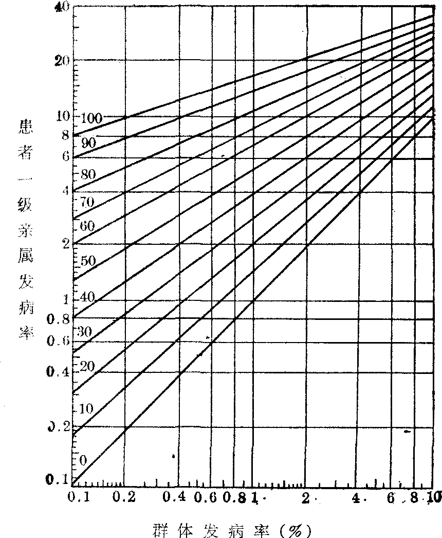 多基因遗传病再现风险的估计 将群体发病率、患者一级亲属发病率与易患性的遗传力的关系制成一张图(图5)。从图中可以看出,当群体发病率为0.01~0.001时,遗传力如果是70~80%,则患者一级亲属发病率近于群体发病率的开方值。因此,可以用下列公式来求患者一级亲属的发病率,f=