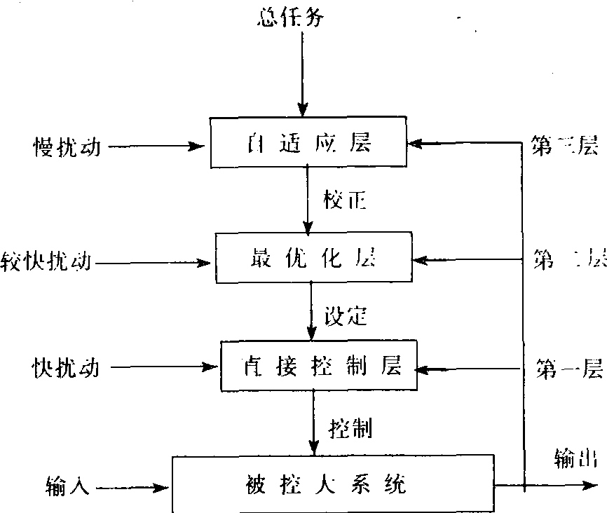 大系统控制结构的一种。这种结构的一个突出特点是: 按任务或功能分层,在各层之间存在着不同分工,一般来说,层次越高,任务或功能越复杂,干扰的变化也较慢; 反之,低层的任务或功能较简单,干扰的变化也较快。第一层是直接控制层,根据上层的决策直接控制大系统的过程或状态,它所受到的干扰频率高、变化快; 第二层是最优化层,根据上层给定的品质指标和约束条件、系统的数学模型,通过制定直接控制的策略,并设置其给定值,实现大系统的最优控制,它受到的干扰频率较高,变化较快; 第三层是自适应层,根据外部环境的变化、系统的总任务、总目标制定计划,对系统及控制结构进行调整,校正大系统的最优运行,以适应环境的变化,它受到的干扰频率低、变化慢,如下图。