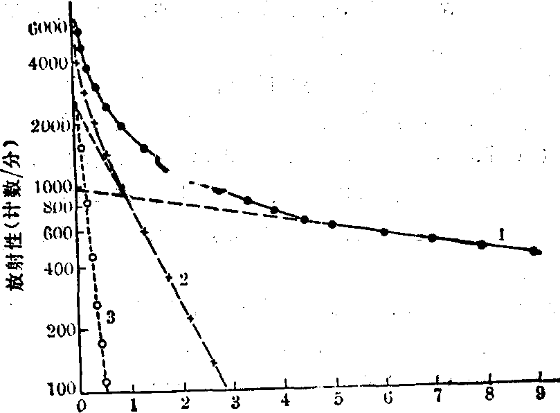 ❷在前述外推线上读出各个时间的放射性,自实验曲线相应的读数减去外推线上放射性的数值,将所得到的差值再画成第二条曲线。此曲线代表另外两种核素(在举例中为24Na和132I)的计数率之和。又将此第二条曲线的直线部分外推至零时,重复上述步骤,即可求出后两种核素的半衰期。 (2)利用射线的不同: 当一种核素只发射β线,而另一种只发射γ线时,这两种核素一同存在的标本,可先用盖革计数器来测量β线,后用闪烁计数器来测量γ线。例如22P只发射β线,而51Cr只发射γ及X线;含有这两种核素的样品,就可以通过上述两种仪器分别测出每种核素。 两种核素有时也可用同一类型但构造不同的探头加以鉴别。如55Fe由于电子俘获而发射0.15MeV的X线,而59Fe则为β发射体。只要先用装着氩气并带有铍窗的盖革管,再用充满氦气并带有云母薄窗的计数管,便可在同一样品中分别测出铁的两种核素。铍窗足以阻止98%从59Fe射出的β粒子,但能选择性地将55Fe的K层X线测定出来。第二种计数管对59Fe的β粒子的灵敏度要比对55Fe的X线大30倍以上。 安插在探头与样品之间的吸收板也很有用。例如用一定厚度的铝吸收板可将99.9%来自35S的β粒子吸收掉,而却能让131I的γ线(56%)穿过。这样,可以根据插入吸收板前后的计数,计算出双标记样品中每种核素的含量。 (3)利用能量的不同: 最大能量为0.155MeV的14C及最大能量为0.018MeV的3H非常广泛地用于双标记实验。象这样一对不同能量的纯β发射体,最好用能量分辨率高的液体闪烁β谱仪来测定。此时可将该谱仪的两个分析器调在不同脉冲高度,使14C的分析道只能测量14C的部分脉冲,而3H道则能测量3H的全部脉冲及14C的小部分脉冲。然后通过外标准道比法(见“液体闪烁测量”条)测知两种核素在两道中的效率,并用一联立方程式解出两核素的衰变率。三种或多种不同能量的核素也可用类似方法测量。 具有单道脉冲分析器的γ能谱仪,可以很方便地用来测定临床诊断中最常用的各种γ发射体,如125I(能量为0.027MeV)及131I(能量为0.36MeV)的混合物。在活化分析或全身计数中,往往要求同时测量多种核素,那就必须采用多道γ谱仪,以及能够处理大量数据的电子计算机。 对于能量差别很大的两种β发射体或γ发射体,也可应用最简单的吸收法。例如,为了分开45Ca(最高能量为0.25MeV)及32P(最高能量为1.71MeV)的β-线,可在样品与盖革管之间,插入50mg/cm2厚的铝板。为了分开51Cr(能量为0.32MeV)和59Fe(能量为1.1及1.3MeV)的γ线,可插入一块4mm厚的铅板。 切伦科夫辐射测量也可用于选择性地测量双标记样品中高能量的β-发射体(参见“切伦科夫辐射”条)。 (4)化学分离法: 有时用燃烧法或湿灰化法进行化学分离。例如先燃烧3H及14C的混合样品,然后用冷阱凝结氚水、碱剂吸收14CO2。 (5)其他分离方法: 层析、离心、电泳、离子交换树脂、凝胶过滤等都可用于分离不同的核素。Al2O3柱层析,常用来分开母体与子体核素。对于24Na及82Br的混合液,通过阴离子及阳离子交换树脂,便可以分别全部除去其中的一种放射性核素,而留下另一种。 在实际应用中还可以合并使用上述各种方法,以达到更有效的分离和获得更准确可靠的测定结果。 双标记测量技术 双标记是多标记中最简单的一种,也是最常遇到的一种。此时,分子内含有两种不同的核素,或实验中采用两种不同的示踪原子。双标记样品中两种放射性核素的含量,可以从该样品在两种测量条件下的计数率而计算出来。这两种核素,由于射线的种类、能量及半衰期等性质的差别,在两种测量条件下计数率的比值(K)是互不相同的。每种核素的K值可由测定单标记的样品而求出。