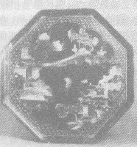 汉代漆器,1963年江苏省盐城县三羊墩一号汉墓出土。高八厘米,口径二十七厘米,底径十一点八厘米,麻布胎,器身内外髹黑漆,内壁与内底间髹赭色漆,口沿上镶饰一道鎏铜扣。敞口,平唇,腹下收敛,圆底内凸。纹饰均采用朱红漆勾勒,由粗细匀称柔劲的线条,再辅以其他色彩,组成各式云纹图案。线条卷曲生动,云头用小勾组成,内填朱红色漆,有如天开云端。漆盘内底满饰圆形图案,突出“大官”两字为中心,文字用朱红漆书写。周围以环形结构的云纹把圆形图案分成三组,并以熊为主体装饰。内底边缘外用朱红漆书写“上林”二字,系汉代隶书体,表现出扁方形的结体形态,端庄、质朴、浑厚,波势明显使字体本身艺术化、装饰化,极为精妙。内底边缘的花纹线条采用锥刺加以镌刻,并在刻划字体与花纹中夹杂着多色油彩,再髹以朱红漆,线条柔和流畅,宛如书写而成,不失为西汉末期髹漆工艺的佳作之品。现藏于南京博物院。