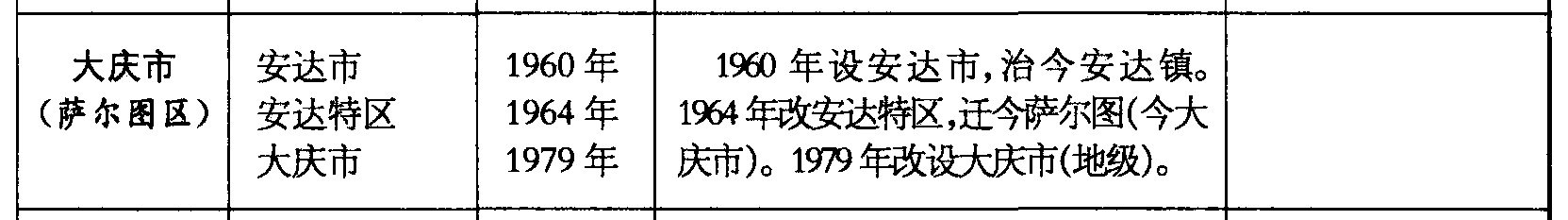 大庆市(萨尔图区)安达市安达特区大庆市1960年1964年1979年1960年设安达市,治今安达镇。1964年改安达特区,迁今萨尔图(今大庆市)。1979年改设大庆市(地级)。