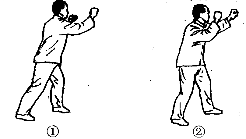 ❷两手两腿之间要相互呼应,上下配合要协调。意念:试力时想象双拳似系有弹性皮条,运转时与之牵拉抗衡;发力时似突然间将两拳间的弹性皮条扯断。注意事项:老年初学者练习炮拳试力时,要特别注意两拳沿直径一样的攻守圈路线同时运转,发力时注意腰部向后顶。