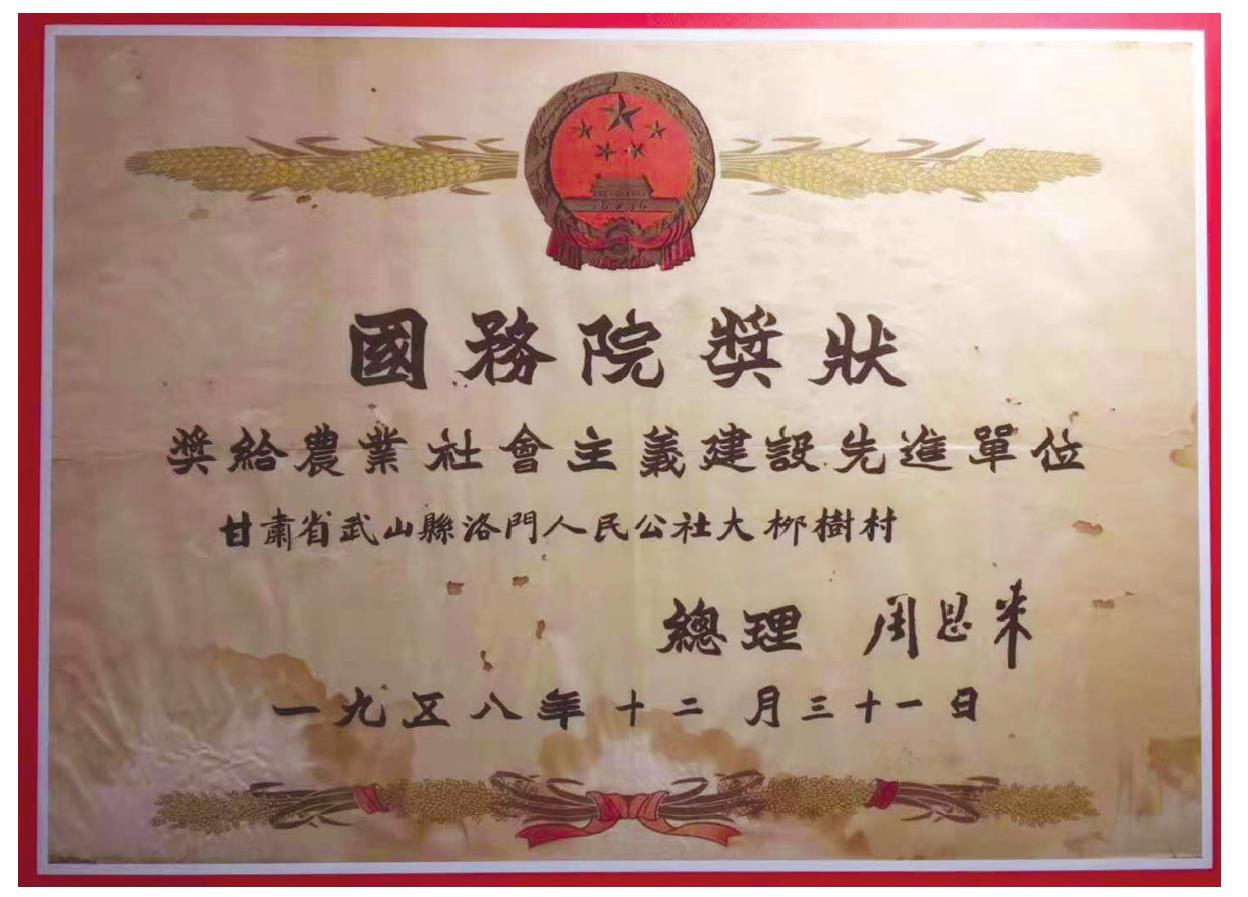 1958年12月国务院颁发的奖状 ☚ 天水市红十字会 城市社区卫生 ☛ 大柳树村 大柳树村牡丹镇辖村。位于牡丹镇东南川区。全村有一个自然村(马家窑),6 个村民小组,274 户 1274 人。耕地面积 4324 亩,农作物主要有小麦、玉米、油菜、马铃薯、葵花等。2008 年被秦州区列为新农村建设示范村,建有占地 1200 平方米的文化广场,配置了健身器材。 ☚ 牡丹村 汪川镇 ☛ |