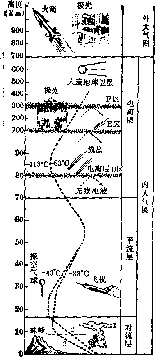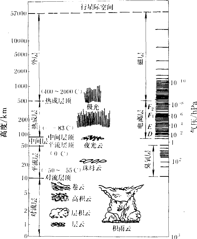 图4 对流层的分层示意图 生物圈是地球上生物主要活动空间。分布于地表上下的大气、土壤、岩石、水域中。在大气圈内的那部分生物圈,位于对流层下部,愈近地面,生物活动愈多。贴地层是大气圈内生物活动最多的地方,对农业生产的影响最大。 对流层顶为对流层与平流层间的过渡区,厚达几百米到一、二公里。对流层顶内温度随高度增加而缓慢下降,有时甚至呈现温度随高度不变或微有增加的现象。中纬度对流层顶的温度, 约在—50~—55℃之间。 平流层 位于对流层顶至50公里之间。其下半部,温度随高度增加而升高并不快; 但其上半部, 温度随高度则增加较快。平流层内包含臭氧层。由于臭氧能吸收波长在0.2~0.31微米的太阳短波辐射, 致使平流层内温度随高度增加而增加。空气以水平运动为主,垂直对流运动十分微弱。大气污染物进入平流层后能长期存在。在高纬地区, 冬季在20~30公里高度上有珠母云, 呈虹彩色泽, 晨昏可见(见云雾现象)。平流层顶部称平流层顶, 位于离地50~55公里处, 温度已达0℃左右。 中间层 自平流层顶至85公里左右。温度随高度升高而迅速下降。有强烈的对流运动, 故有上对流层之称。中间层顶部称中间层顶,位于离地80~85公里,该处温度已低于-83℃。在中间层顶附近, 高纬地区的黄昏时刻, 有时会出现夜光云(见云雾现象)。60公里以上, 空气分子能吸收太阳紫外辐射而发生电离。习惯上又把60公里至中间层顶附近的范围称为电离层的D层。 热成层 又称热层或暖层,自中间层顶至250公里(太阳平静时)或500公里左右(太阳活动强烈时)。温度随高度增加而上升(图3)。由空气直接吸收太阳辐射(波长小于0.2微米)引起。热成层的温度变化十分大:在500公里高度上, 温度变化范围是400~1200℃, 变化情形与一天的时刻、太阳活动的强弱、纬度等有关,其日变化可达500~800℃, 日出前具有最小值, 下午二时左右具有最大值。热成层中的高温, 只能说明分子的平均动能很大。热成层上部温度不再随高度变化的高度称热成层顶。热成层顶的高度是变化的:从250公里变至500公里左右。根据热成层的电离特性,习惯上常把90~140公里间的范围称为电离层的E层, 而把140~500公里间的范围称为电离层的F层。 外层 或称散逸层。一般指500公里以上的大气。此层内温度随高度变化很少。这一层中, 空气粒子很少互碰, 中性粒子基本按抛物线轨迹运动, 有些速度较大的中性粒子, 能克服地球引力而脱离地球大气。但带电质点的运动主要受地球磁场的控制,因此500公里以上的大气也称磁层。 大气❶指太虚,即宇宙。《素问·五运行大论》:“岐伯曰:地为人之下,太虚之中者也。帝曰: “冯乎?岐伯曰:大气举之也。”王冰注:“大气谓造化之气,任持太虚者也。” 大气atmosphere又称地球大气。由于重力作用而维持在地球上的气体层。由多种气体混合组成。它的总质量约为5.14×1018 kg,其中50%集中在6 km以下大气层,99%集中在35 km以下,99.9%集中在50 km以下。海平面的平均大气压是1 013 hPa,平均空气密度约为1.2kg·m-3,气压与密度随离地距离的增加而近似地按指数规律减小。 大气❶自然界的空气。 大气 大气Daqi包围着地球的空气。受地球引力作用,空气呈圈层包围着地球,其质量约5.3×1021克,占地球总质量的百万分之一,其中90%聚集在距地表15公里以下的气层内,99.9%在48公里以内,到2000—3000公里高度大气密度已极其稀薄,非常接近星际空间。因而,一些学者把2000—3000公里定为大气层的上界。大气是由氮、氧、氩、二氧化碳、氖、氦……等多种气体混合组成,其中氮、氧、氩是最主要成分,分别占总体积的百分之78.9、20.95、0.93,三者之和占99. 96%,其余气体含量甚微,总量不足0. 04%。大气中还有少量水汽和固态、液态杂质集中在大气低层。大气层在垂直方向上的温度、运动状况和电离状态都有明显差异,一般划分为五个层次。 ☚ 气象·气候 大气温度 ☛ 大气见“大气圈”。 大气大氣dà qì❶化生万物的天地之气。《医门法律·大气论》:“设非大气足以苞地于无外,地之震崩坠陷,且不可言。胡以巍然中处而永生其化耶?” 大气 大气包围地球的空气层称“大气圈”或“大气层”,其全部或一部分往往亦称“大气”。大气是由多种气体混合组成。氮、氧、氩、二氧化碳等是大气的固定成份,其比例关系在一定高度以下保持恒定。如在30km高度,氧和氮的比例仍保持1:4,与海平面相近。大气中的非固定成分,有水汽、臭氧、灰尘等,含量不定,常只限于某一特定高度范围。如水汽,绝大部分存在于7km以下大气中,含量为1~5%。在20~50km高度范围,大气中含有较多臭氧,浓度最高处可达12ppmV。在600~700km以上高度,主要成分为较轻的气体,如氦;在氦层以上还有更稀薄的一层氢(质子层)。
