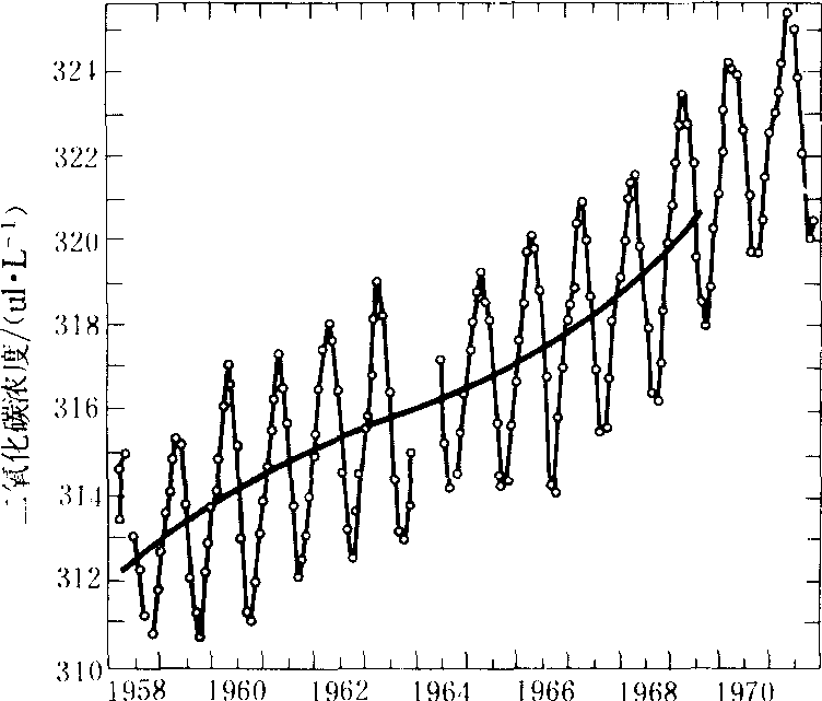 氮和氧 大气中含量最多的成分, 占空气体积的99.03%。氧气是人类、生物呼吸不可缺少的气体。氮气是合成氨的基本原料, 也可通过豆科植物的根瘤菌固定到土壤中, 成为植物所需要的氮化合物。空中闪电路径上造成的高温, 能使氮和氧合成为氮氧化合物(N2+O2??2NO, 2NO+O2→2NO2), 经雨滴吸收后变成极稀的硝酸 (2NO2+H2O→HNO3+HNO2),进入土壤后再与其他物质化合成植物所需的硝酸态氮。 二氧化碳 在对流层下部的含量,因地因时而异,城市多(大城市CO2浓度可超过0.0005),农村少。绿色植物的光合作用能吸收CO2,放出氧气。地面附近CO2的含量又随植物的盛衰及昼夜阳光的有、无、强、弱,而发生季节变化及日变化, 且随高度改变。CO2对太阳辐射吸收弱, 但易吸收和放射长波辐射, 对大气有保暖效应(曾误称为花房效应, 见地球辐射)。由于工业发展及森林面积的减少, 大气内CO2的含量有逐渐增加的趋势(图2)。1978年CO2的含量已达332×10-6。但由CO2增多引起的气候影响目前尚无定论。