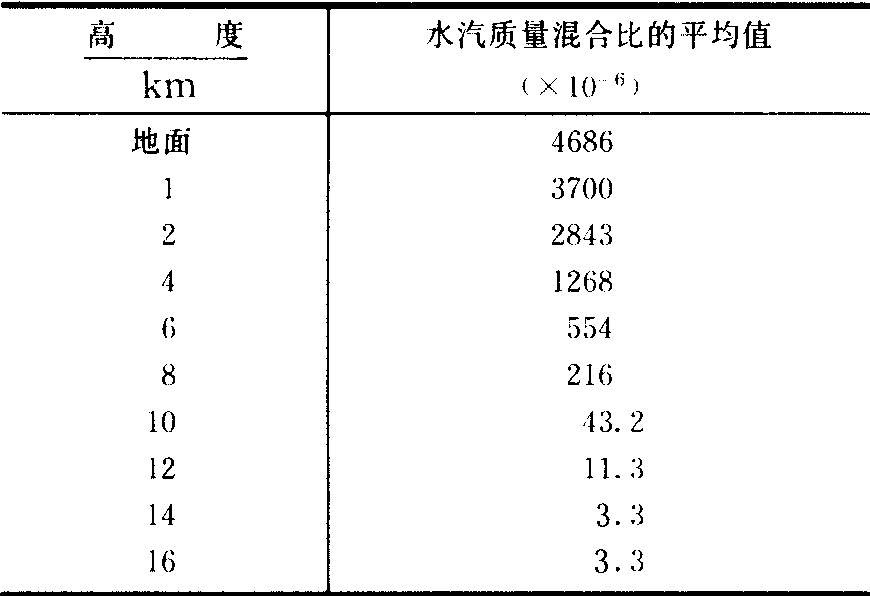 时间/a 臭氧 主要分布在10~50公里间(称臭氧层), 其最大浓度出现在20~30公里。该处的臭氧浓度常超过1×10-6, 甚至可达10×10-6。大气低层的臭氧含量少,典型浓度是5~50×10-9(未污染空气) 至500×10-9(地面污染空气)。高空的臭氧由光化反应生成, 低空的臭氧一部分从高空输来, 一部分由闪电等造成。大气中的臭氧总量很少, 如把横截面积为1厘米2的整个垂直大气柱内的臭氧订正到标准状况(气压是1013.25百帕, 温度是273K), 平均就只有0.3厘米厚的一层。臭氧浓度随纬度、时间、天气形势而异。臭氧能强烈吸收太阳光中的紫外线。使地面生物免受过多紫外线的伤害。近地面层若臭氧过多, 便对生物有害。 水汽 空气中的水汽含量, 随时间、地点而不同:沙漠(或极地)上水汽含量极少, 热带洋面上的水汽含量按体积百分比计算可达4%。一般情况下, 高度越高, 水汽含量越少(表2),但有时在个别气层中也偶见水汽含量随高度升高而增多的现象。水汽在大气内能发生相变, 产生云、雾、雨、露、霜等。水汽对太阳辐射吸收弱, 但易吸收和放射长波辐射, 对大气保暖效应有贡献, 水汽含量的增多能增强大气逆辐射, 能减弱地面有效辐射。 悬浮杂质 其含量及分布随时间、地点而变。它们使能见度变坏; 吸收并反射太阳辐射; 易于吸收和放射长波辐射, 影响地面和空气温度, 它们中有些能促进水汽凝结, 对云雾降水的形成起重要作用。 在100公里以上,各种气体逐渐变成为原子态。由于分子扩散作用超过了涡动扩散作用, 气体成分发生重力分离: 造成轻的气体在上、重的气体在下。空气分子量随高度增加而逐渐变小。在100~1000公里间,这一层底部以氮分子为主,其余大部分区域以氧原子为主; 1000~2400公里间, 以氦原子为主;2400~约10000公里, 以氢原子为主。 表2 中纬度不同高度上的水汽含量