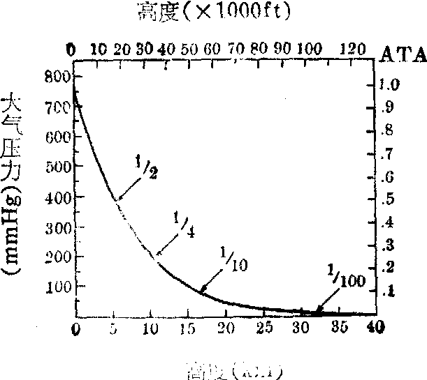 图1 大气层 1. 积雨云 2. 低纬度地区温度27℃ 3. 高纬度地区温度7℃ 标准大气 表明大气状态的各项物理参数,如气压、气温、密度等,除呈现上述垂直方向的基本规律性变化外,还受地区、季节、昼夜等因素影响,而具有一定变异范围。 许多实际工作都要求能给出反映大气平均情况的统一大气参数条件。为此,乃根据大量实测数据的年平均值,规定最接近实际大气的理想大气参数条件,称“标准大气”。随着空间科学技术的发展,一些国家不断提出新的“标准大气”方案。新方案中亦有称标准大气为“模式大气”的。国际科联(International Council of ScientificUnions)下属的空间研究委员会(Committee on SpaceResearch,COSPAR)于1961年公布的 “国际标准大气CIRA-61”目前仍被广泛采用。此方案给出从海平面到800km高度范围主要大气物理参数的平均值、最小值、最大值,高度间隔为2或4km。我国航空工业部门目前使用的“标准大气表”具有以下特点: ❶高度范围,-500~30000m。 ❷高度间隔,-500~1500m范围的间隔为50m;1500~20000m,100m; 20000~30000m,500m。 ❸采用下列国际标准大气常数:45°纬度地区海平面大气压力为10332.3kg/m2 (760mmHg),气温为15℃,空气比重为1.2255kg/m3等。在气体环境生理学研究工作中,“简要标准大气表”(表2)所列数据已可满足需要。在低气压实验中,根据一定气压值由表查得的高度称“气压高度”。 大气的功能 大气层不仅为地表面的人类和生物提供了适于生理需要的气体环境,具有生命支持作用;又因能滤除有害的辐射、流星的侵袭等而具有生命保护作用。此外大气也与地面温度、光学及声学环境等的形成密切相关。但随高度增高,由于空气变得稀薄,大气的这些功能乃逐步减弱,直至消失。各种大气功能完全终止的高度先后不一。如大气对人体供氧作用完全终止的高度约为15km(此高度,大气压力已与肺泡内水汽及二氧化碳分压之和相等);大气压力对人体保护作用的完全终止高度约为20km(因高度真空环境,体液已不能保持液态而不断气化);大气光学的终止高度约为100km等。为此,高空飞行时,须采取相应防护措施。大气的空气动力学效应是航空的前提,也有一定高度的限制,60~80km为其最终界限。 表1 大气圈的层次