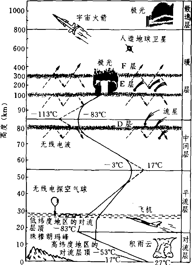 | 释义 | 大气层结构atmospheric stratification根据大气铅直方向各种特性,将大气分成的若干层次。按大气温度随高度变化的特征,可把大气分为对流层、平流层、中间层、暖层和散逸层等5层。按大气各组成成分的混合状况,可把大气分为均匀层和非均匀层。按大气光化反应,有臭氧层。按大气电离状况,可分为电离层和非电离层。