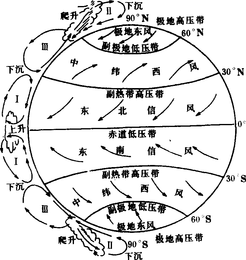 图 4 世界7月海平面气压图 大气环流general circulation大气圈内空气作不同规模运动的总称。按照空间与时间尺度的不同可分为3个级别:反映全球大气运行概貌的三圈环流为一级环流,具有大范围扰动中心的独立闭合环流为二级环流,小尺度的局地环流为三级环流。按照气流运行方向的不同又可分出两种环流型:沿纬圈方向流动或波动形式中向东向西气流为纬向环流,沿经圈方向流动或波动形式中向南向北的气流为经向环流。大气环流是大气中热量、水汽和动量等输送交换的重要方式,是形成各种天气和气候的主要因子之一。当大气环流趋向长年平均情况时,各地气候就较正常;当环流在某一时期出现异常时,将会引起各地天气、气候的反常,以致气象灾害频繁。 大气环流 大气环流daqi huanliu指运动规模比较大、持续时间比较长、变化比较缓慢的大气运动。它反映着大气运动的基本状态和变化特征,孕育和制约着较小规模的气流运动,是各种规模系统形成和发展的基础,是各地天气、气候形成、演变的背景。 ☚ 大气活动中心 沃克环流 ☛ 大气环流 大气环流Daqi huanliu指运动规模比较大、持续时间比较长、变化比较缓慢的大气运动。它反映着大气运动的基本状态和变化特征。同时它孕育和制约着较小规模的气流运动, 是各种规模系统形成和发展的基础, 是天气、气候形成、演变的背景。 ☚ 风 山谷风 ☛ 大气环流 大气环流Daqi huanliu指运动规模比较大、持续时间比较长、变化比较缓慢的大气运动。它反映着大气运动的基本状态和变化特征,孕育和制约着较小规模的气流运动,是各种规模系统形成和发展的基础,是各地天气、气候形成、演变的背景。它使高低纬度之间和海陆之间的热量和水汽得到交换,从而促进地球上的热量平衡和水量平衡。形成大气环流的主要因素是:高低纬之间受热不均和地转偏向力。在南北半球各有方向相反的三圈环流:低纬环流、中纬环流、高纬环流(如图所示)。由于海陆分布、地形起伏等因素的影响,地球上还存在各种不同规模的大气环流。反映大气环流的基本特征需要采用平均图,即时间平均和空间平均图。因为通过时间平均可以把那些时间短暂、瞬息万变的环流系统滤掉,显现出存在时间较长的稳定的基本形式;通过空间平均可以把一些规模较小的系统滤掉,显现出各纬圈上环流的基本特征。比如平均纬圈环流:大气环流基本上是水平运动,而水平运动又以极地为中心旋转着的纬向气流最盛行,南半球更为显著。对流层的低纬度地区盛行东风,称东风带,又称信风带,其范围随高度减小,风向风速比较稳定。中高纬度地区盛行西风,称西风带,其所跨纬度除低层外,均较东风带为宽。中纬度地区西风的强度随高度迅速增大,最大风速出现在30—45°上空200百帕附近,称为西风急流。极地附近低层是较为浅薄的弱东风,称极地东风带(如图所示)。此外还有平均经圈环流和平均水平环流,它们相互联系、相互制约,共同构成了大气环流整体。广义的大气环流还包括季风环流、海陆风、山谷风,以及气旋、反气旋等。