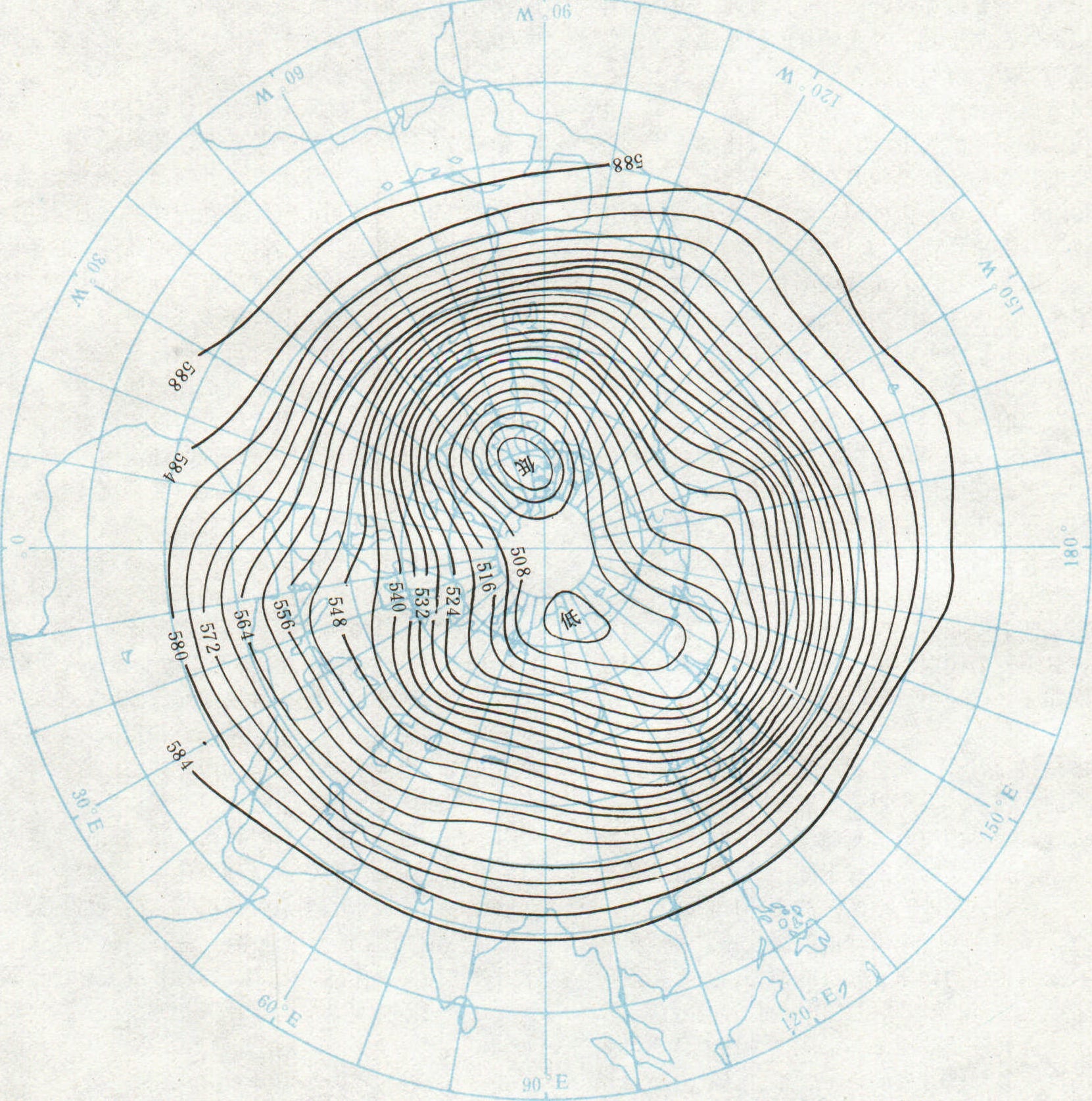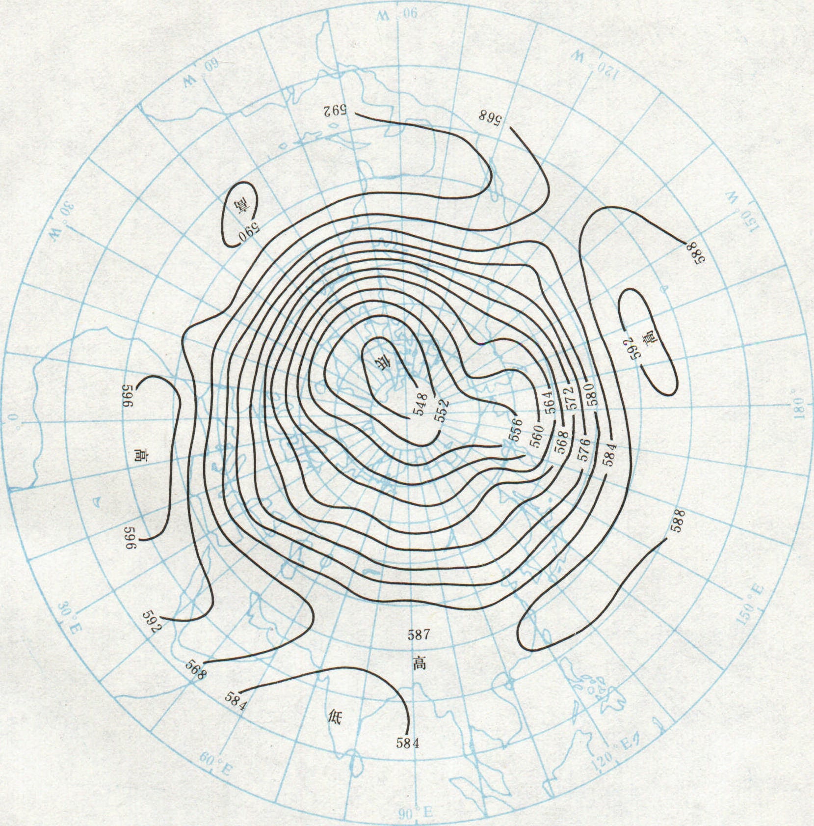图2(b) 北半球7月500hPa等压面图 大陆上形成两个热低压(亚洲低压、北美低压), 海洋上的两个低压(冰岛低压、阿留申低压)很弱, 副热带高压增强并北移。大气活动中心的季节交替, 在亚洲大陆上最显著, 基本上决定了该地区的天气和气候。季风也是大气环流的组成部分(见季风气候)。从广义上说,因局地因素产生的以日为周期的空气流动(局地环流), 包括海陆风、山谷风以及其它地方性风系也属大气环流范畴(见下垫面)。 大气环流是形成气候的重要因子。大气环流异常是引起大范围天气和气候异常的直接原因, 对农业生产影响很大。研究大气环流规律, 对解决中、长期天气预报、气候学的理论和实际问题有重要意义。