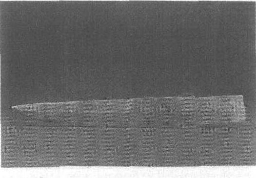 1974年湖北省黄陂县盘龙城出土,湖北省博物馆藏。商代中期玉质仪仗器。长94厘米,援宽13.5厘米,玉质呈青黄色。直内式,内前端有一圆穿,援作宽长条形,中起脊,前锋薄而利,呈三角尖刀形。通体琢磨光润,制作精致,形体硕大,为商代玉器中所罕见,极为珍贵。