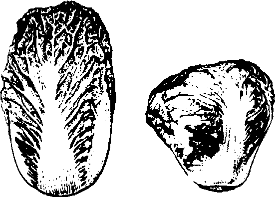 图 1 叶球类型 生长发育和叶球形成 秋播大白菜为典型二年生植物,生长发育过程分营养生长和生殖生长两个时期。秋季在冷凉气候条件下进行营养生长,形成硕大叶球,并孕育花芽。冬季休眠,翌春在温和及较长日照下抽薹、开花、结子,完成生殖生长。由于种子萌动后就能感受低温,在0~10℃经10~30天通过春化阶段,因此早春播种当年也可开花、结子,表现为一年生植物。 营养生长时期 秋播大白菜生长经历发芽期、幼苗期、莲座期、结球期和休眠期:❶发芽期:从种子萌动到真叶显露,在适温20~25℃约需5~6天。 ❷幼苗期:从真叶显露到第7~10片叶展开,生长适温21~23℃,需16~20天。此期结束的临界特征为叶丛呈圆盘状,俗称“团棵”。 ❸莲座期:从团棵到第23~25片莲座叶全部展开并迅速扩大,形成主要同化器官。此期结束的临界特征为叶丛中心叶片出现抱合生长。在17~22℃适温下,早熟品种需15~20天; 中、晚熟品种需25~28天。植株苗端在此时期逐渐向生殖顶端转化,球叶分化相继停止。 ❹结球期:从心叶开始抱合到叶球形成,生长量最大,约占植株总生长量70%左右。生长适温白天15~22℃;夜间5~12℃。结球期长短因品种而异。早熟品种25~30天; 中、晚熟品种25~50天。结球期常分为前、中、后三期。 ❺休眠期:叶球因气候转冷被迫进入休眠。温暖地区没有休眠期。 叶球形成以前,尽可能促使苗端分化更多球叶:在结球期要求光照充足,气候凉爽和日夜温差大,以满足球叶生长所需大量同化物质。伊东秀夫(1957)认为球叶抱合与弯曲,是因叶背面(即背轴面)细胞比叶腹面(即向轴面)细胞伸长较快的缘故;而这种偏下性生长是受植株碳氮比率(C/N)及内源激素种类和含量控制的(见叶球)。 生殖生长时期 秋播大白菜进入结球期,营养苗端已转变为生殖顶端,某些品种在结球中期甚至已分化出花序原基和花原基。只因这时温度日趋降低,日照愈来愈短,花器呈现缓慢生长状态,潜伏于叶球中,而于翌春进入生殖生长时期。一般经历返青期、抽薹期、开花和结果期。种株在温度5~10℃时由休眠状态转为活动状态,球叶由白色逐渐变绿,开始发生新根;随后开始抽薹,并不断发生分枝,生长适温18~20℃。以后自下而上不断开花和结成角果,至种子成熟。冬、春温暖的南方地区,栽培早熟品种常在结球后期便抽薹孕蕾,遇温暖气候便抽生花枝和开花。