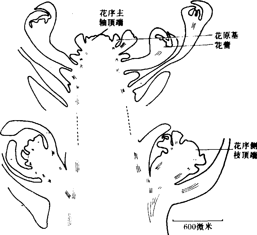 图2 大白菜花序纵剖面示意图 栽培技术 中国各地大白菜均以秋季栽培为主。但是只要品种得当,条件适宜,春季或夏季也可栽培;中国南方亚热带地区还可秋冬栽培。春季栽培因前期低温,易使植株通过春化阶段,常常未形成叶球便先期抽薹;或已结球,而后期遇高温、阴雨引起叶球腐烂。欲使春季栽培成功,须选用冬性强、生长期短的品种,并采取保护设施育苗,适当增加密度,加强肥水管理和适期收获等措施。夏秋栽培,则须选用较耐热、抗病的早熟品种及相应的防病、防涝、防旱的管理措施。 秋季大白菜高产优质关键措施之一是适期播种,中国各地都有比较严格的适宜播期,自北向南从7月依次推迟至9月。大白菜根系较浅,吸收能力较弱,发叶速度快而生长量大,蒸腾水量多,宜肥沃、疏松、保水、保肥的中性或微酸性粉沙壤土、壤土和轻粘壤土。要求良好的排、灌条件。中国北方多用垄作或平畦栽培;南方为高畦栽培。垄作和高畦便于排水和保持土壤疏松,植株根群发达,能减轻软腐病危害。采用直播或育苗移栽。直播方法简便、省工,但播期要求严格,苗期遇不良气候则较难控制。育苗移栽节约苗期占地,苗期管理方便,又利于前茬作物的延后生长,但移栽费工,须精细管理促使秧苗成活。不论哪种方式,都要注意提高播种质量并加强苗期管理,防旱、排涝,及时间苗,减轻或控制病毒病等病害的发生和蔓延。 合理密植是提高大白菜产量和商品质量的重要措施。种植密度因品种、地力和气候条件而异。合理密植的指标是植株所占的营养面积约等于或稍小于莲座叶丛垂直投影的分布面积为宜。不同品种要有相应的合理密度。同一个品种,气候条件适宜、肥水条件好,密度可稍小; 反之,密度宜稍大些。植株田间布局的方式也影响大白菜的生长。为便于田间操作,一般是行距略大于株距。 每生产1 000公斤大白菜,大约需要吸收氮1.5~2.3公斤,磷0.7~0.9公斤,钾2.0~3.5公斤,氮、磷、钾吸收量的比率大致为2:1:3。对氮、磷、钾的吸收数量苗期较少,莲座期较多,结球期最多。从苗期到莲座期约占总吸收量的20~30%,结球期约占70~80%。幼苗期吸收氮多,钾次之,磷最少; 莲座期、结球期则吸收钾最多,氮次之,磷最少。在生长期间,施氮肥数量过多,会使叶球含水量增加,含糖量降低,品质下降。为满足大白菜生长对营养元素的需求,应根据目标产量计算吸肥量、土壤肥力、肥料种类及肥料利用率等,进行综合分析后确定合理的施肥指标。施肥种类应是有机肥和无机肥配合施用。有机肥和磷肥主要作基肥施入,无机肥和部分速效有机肥用作追肥。追肥占总施肥量的1/3,分3~4次施用,重点施肥期在莲座末期至结球初期。 大白菜叶片多,叶面角质层薄,水分蒸腾量很大。在营养生长时期,土壤水分以维持田间持水量的80~90%为宜,低于70%时,对产量和品质均发生不良影响。当长期在95%以上高湿条件下,病害重或贮藏期间易脱帮。空气相对湿度以65~80%为宜。过高、过低均对生长、结球不利。发芽期和幼苗期需水量较少,但种子发芽出土需有充足水分;幼苗期根系弱而浅,天气干旱应及时浇水,保持地面湿润,以利幼苗吸收水分,防止地表温度过高灼伤根系。莲座期需水较多,掌握地面见干见湿,对莲座叶生长既促又控。结球期需水量最多,应适时浇水。结球后期则需控制浇水,以利贮藏。大白菜在10℃以下生长缓慢,5℃以下生长停顿,短期的0~-2℃受冻尚可恢复,长时间-4~-5℃受冻后则不能恢复,应在受冻温度来临前及时收获。 采种 为防止品种混杂退化,应进行种株选择和搞好隔离采种。采用空间隔离法繁殖原种时,其采种田应与其他品种和芸薹属中染色体基数x=10的栽培种(如芜菁、白菜、油菜等),至少相距2 000米以上; 生产用种田相隔距离至少1 000米以上。主要采种方法有三种: ❶成株采种法: 秋季在生产田中选留优良植株作种株,冬前收获、窖藏,翌春定植前30~40天“切菜头”处理,土壤解冻后10厘米地温稳定在5℃以上时,定植于采种田。返青期需水较少,应多次中耕保墒,提高地温促进发根。花期需水较多,始花期应追肥、浇水。结果期可适当减少浇水次数,促使种子成熟。此法便于选种和保持良好种性,一般在繁育品种的原种时采用。 ❷半成株采种法: 秋季适当晚播,种株在越冬时仅有10~20片莲座叶或松散叶球,经冬季贮藏后,翌春定植于采种田(管理同成株采种法)。此法种株长势较强,种子产量较高。缺点是未经结球期,无法严格选留种株,难以保证种子纯度。繁殖生产用种或抗病性弱的品种繁育原种时多采用此法。 ❸小株采种法:早春直播采种,或用冷床育苗,于6~7片叶定植采种。方法简便,成本低,产量较高,但须有纯度好的种子作原种,才能用此法繁育生产用种。配制杂种一代多用此法。 贮藏与加工 中国北方各地冬季大量贮藏大白菜,冬、春供应。贮藏方式因气候和贮藏条件而异,有堆藏(也称垛藏)、埋藏、窖藏等多种方式。在中国南方大部分地区大白菜能在田间越冬,可根据需要随时收获。 大白菜简易加工,可制成下列产品:❶腌白菜:先洗净,切开码于缸内,一层菜,一层盐,满缸为止,每100公斤菜,放10~12公斤盐,每天翻动一次,7~10天后可食用。 ❷渍酸菜: 生渍法是将菜洗净,平码缸内,压实,注入温水至使菜淹没。置于10~15℃环境中自然发酵,20天左右即成。熟渍法是将菜洗净后在开水中烫过,立即放入凉水中降温,平