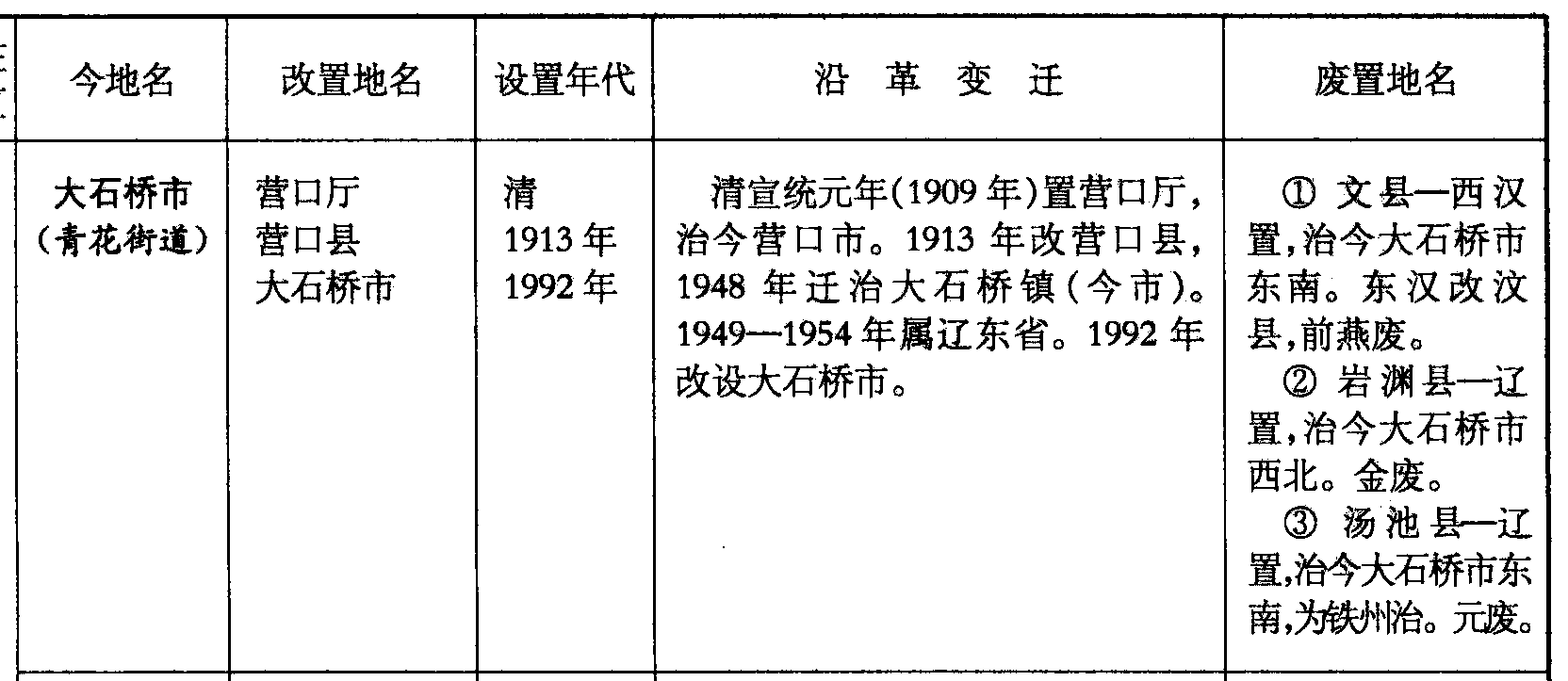大石桥市(青花街道)营口厅营口县大石桥市清1913年1992年清宣统元年(1909年)置营口厅,治今营口市。1913年改营口县,1948年迁治大石桥镇(今市)。1949—1954年属辽东省。1992年改设大石桥市。❶ 文县—西汉置,治今大石桥市东南。东汉改汶县,前燕废。❷ 岩渊县—辽置,治今大石桥市西北。金废。❸ 汤池县—辽置,治今大石桥市东南,为铁州治。元废。