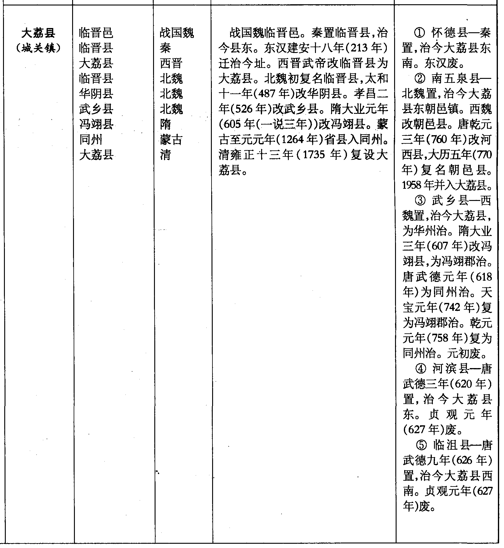 ❸ 武乡县—西魏置,治今大荔县,为华州治。隋大业三年(607年)改冯翊县,为冯翊郡治。唐武德元年(618年)为同州治。天宝元年(742年)复为冯翊郡治。乾元元年(758年)复为同州治。元初废。