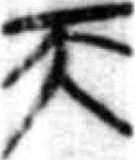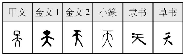 ❹ 拔地参天|白浪滔天|白日升天|抱憾终天|抱恨终天|不共戴天|长剑倚天|胆大包天|飞龙在天|沸反盈天|烽火连天|福寿齐天|覆地翻天|鼓乐喧天|恨抱终天|洪福齐天|祸乱滔天|鸡犬升天|叫苦连天|叫屈呼天|叫屈连天|金鼓喧天|立地擎天|龙马行天|龙驭宾天|锣鼓喧天|没法没天|昧地瞒天|昧地谩天|逆理违天|浓阴蔽天|怒气冲天|杞人忧天|热火朝天|人定胜天|人命关天|人强胜天|人众胜天|日月经天|如日中天|势焰熏天|手眼通天|数九寒天|水光接天|顺人应天|素面朝天|听命由天|铜臭熏天|无法无天|雪窖冰天|烟火连天|仰不愧天|一步登天|一飞冲天|一手擎天|一手遮天|一柱擎天|义薄云天|怨气冲天|只手遮天|罪恶滔天|坐井观天 天天,甲骨文作    ,金文作    ,小篆作 。 象正面人形而突出其頭部,有學者認爲是 “顛” 的初文,而 《新甲骨文編 (增訂本)》有 “顛” 字,與 “天” 的字形無關。“天” 的本義是頭頂,卜辭有用例。由頭頂引申,又表示觀念中的主宰萬物者,即至高無上的天神、天帝或天空、天體。趙誠認爲,甲骨文第四字形从上从大,卜辭用以表示天地之 “天”,與表示頭頂義的 “天”字有别。銘文或用天帝義,或用作人名。 楚簡帛文作  ,沿襲古體。秦簡牘文作 ,古隸典型。參見453.元字條、057.大字條、067.顛字條。 天tiān甲骨文、小篆“大”字之上为一圆点,表示人的头、头顶和头顶上的那片天空。作声符生成的字有:tian 阴平:添(添加) 上声:忝(《说文》:“忝,辱也。”) 舔(用舌头接触或取东西) 去声:掭(轻轻拨动)tūn 吞(吞吐) 天tiān(4画)