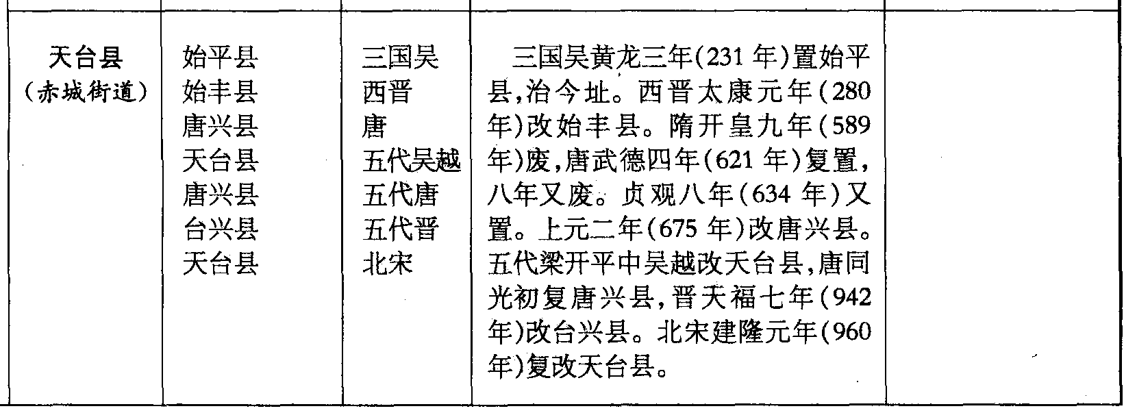 天台县(赤城街道)始平县始丰县唐兴县天台县唐兴县台兴县天台县三国吴西晋唐五代吴越五代唐五代晋北宋三国吴黄龙三年(231年)置始平县,治今址。西晋太康元年(280年)改始丰县。隋开皇九年(589年)废,唐武德四年(621年)复置,八年又废。贞观八年(634年)又置。上元二年(675年)改唐兴县。五代梁开平中吴越改天台县,唐同光初复唐兴县,晋天福七年(942年)改台兴县。北宋建隆元年(960年)复改天台县。