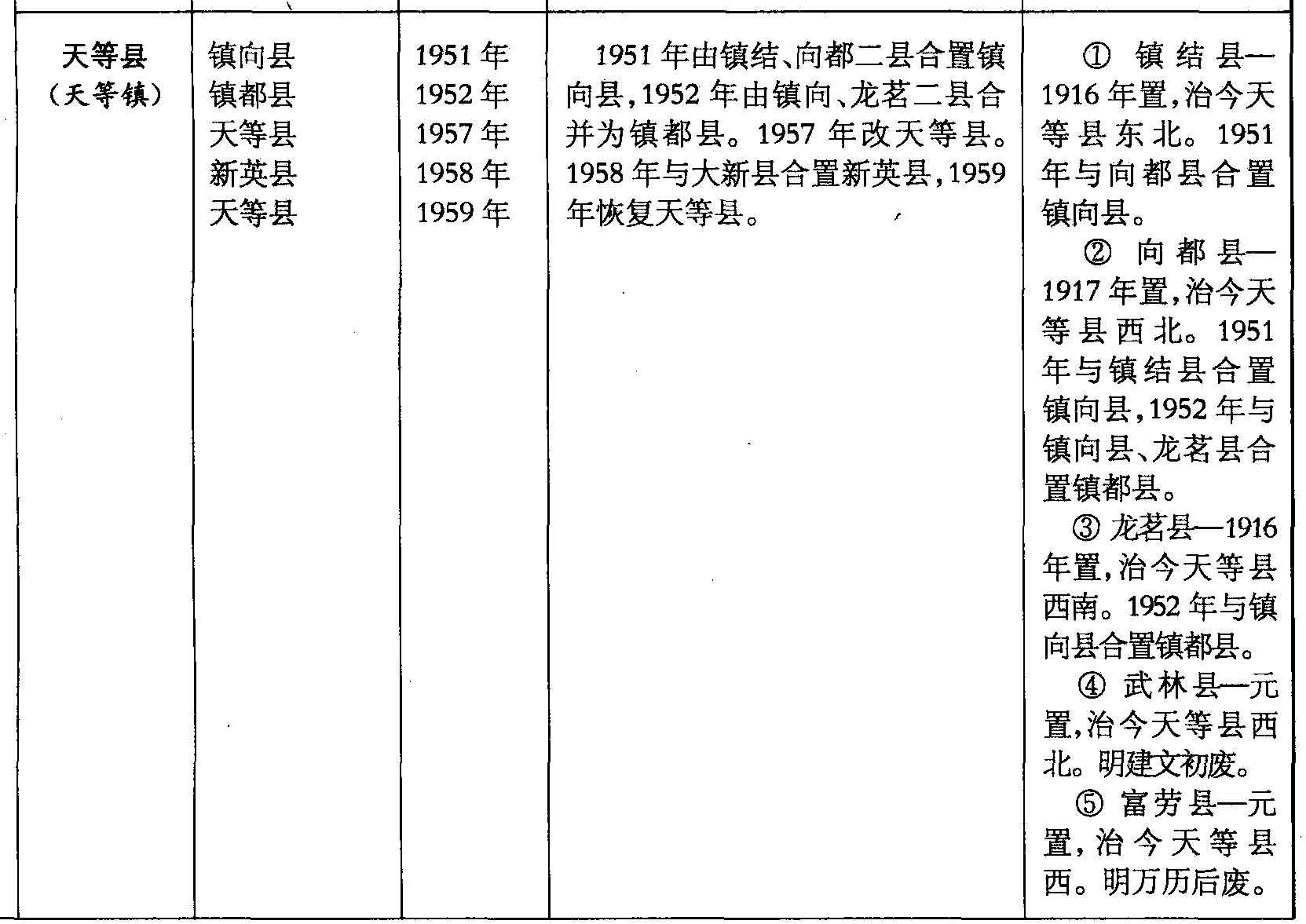 天等县(天等镇)镇向县镇都县天等县新英县天等县1951年1952年1957年1958年1959年1951年由镇结、向都二县合置镇向县,1952年由镇向、龙茗二县合并为镇都县。1957年改天等县。1958年与大新县合置新英县,1959年恢复天等县。❶ 镇结县—1916年置,治今天等县东北。1951年与向都县合置镇向县。❷ 向都县—1917年置,治今天等县西北。1951年与镇结县合置镇向县,1952年与镇向县、龙茗县合置镇都县。❸龙茗县—1916年置,治今天等县西南。1952年与镇向县合置镇都县。❹ 武林县—元置,治今天等县西北。明建文初废。❺ 富劳县—元置,治今天等县西。明万历后废。