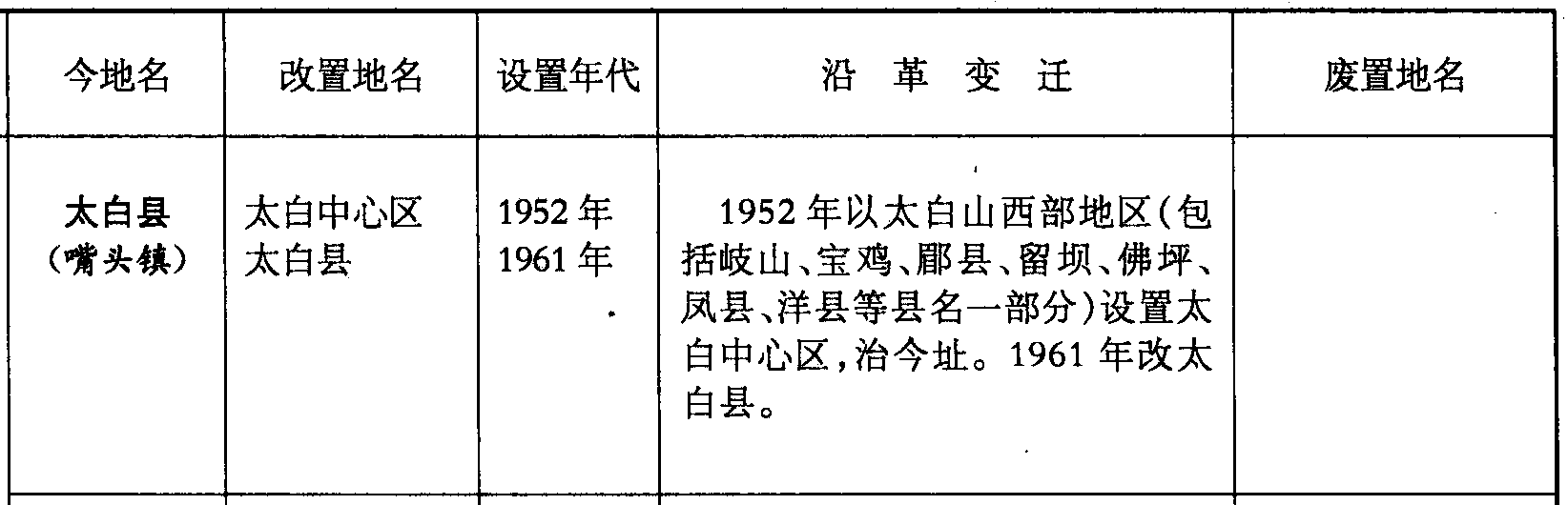 太白县(嘴头镇)太白中心区太白县1952年1961年1952年以太白山西部地区(包括岐山、宝鸡、郿县、留坝、佛坪、凤县、洋县等县名一部分)设置太白中心区,治今址。1961年改太白县。