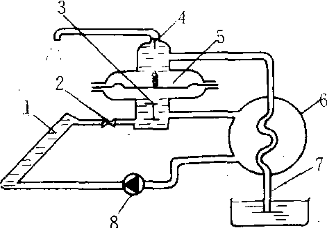 利用戊烷蒸汽驱动隔膜泵的太阳能水泵 1.集热器 2.进气阀 3.汽缸 4.上单向阀 5.隔膜泵 6.冷凝器 7.下单向阀 8.工质泵 |