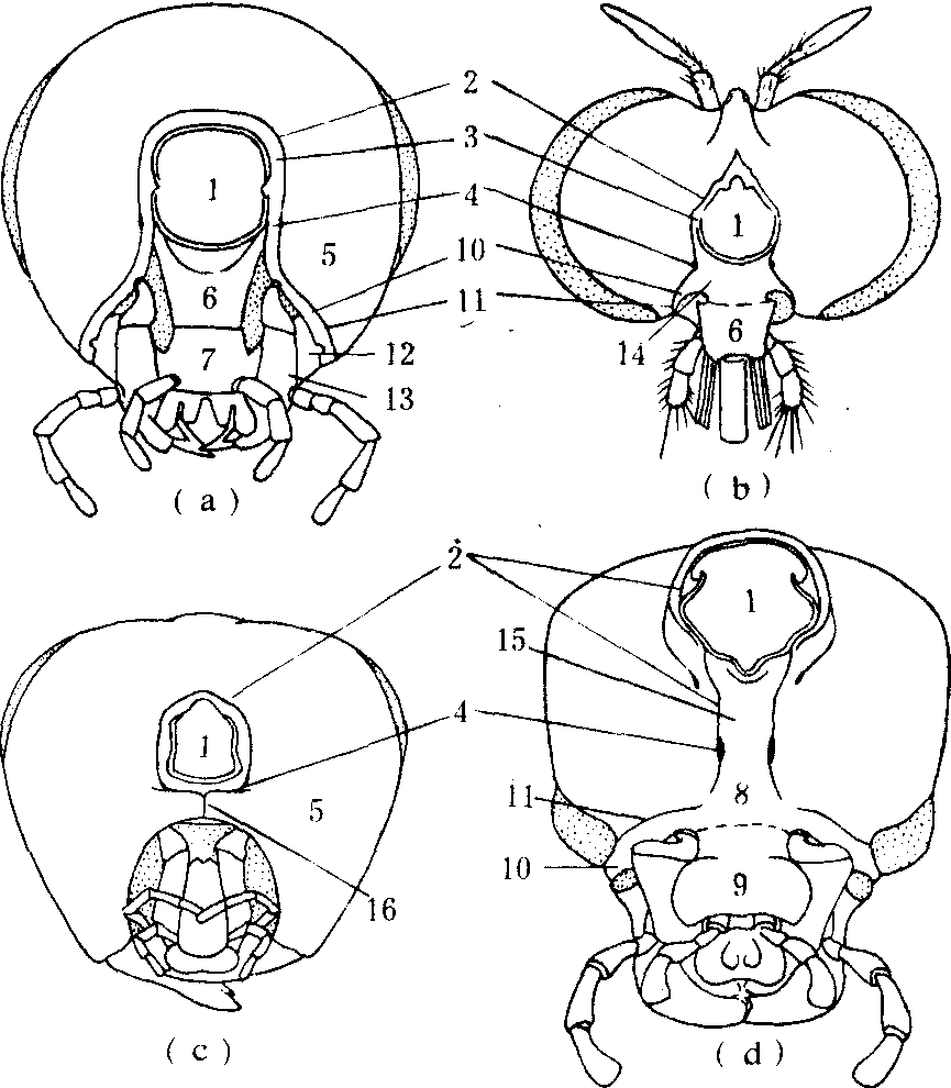 头壳后部 称为后头区,包括后头及次后头(图2a)。后头为拱形的骨片,下部因处于颊之后部而称后颊,后头与后颏之间无明显分界。后头与头顶及颊以后头沟(仅少数昆虫存在)为界。次后头是后头后面环绕头孔的狭带,二者以次后头沟为界。后头上方有后头突与颈部骨片支接,端缘与颈膜相接。后幕骨陷位于次后头沟的腹端。