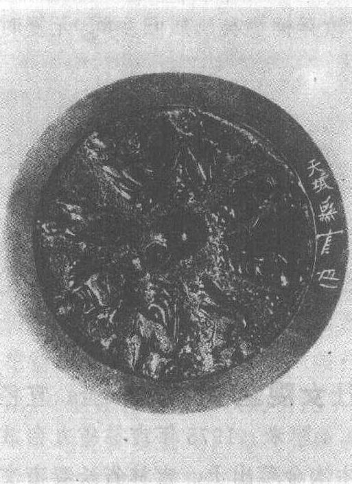 金。直径11厘米。1983年吉林省榆树大坡古城出土。吉林省榆树县博物馆藏。镜圆形,背面中央有圆形素钮,钮外饰有八个乐师,博衣长袖。每人双手执一种乐器,有腰鼓、长坂、手鼓、长箫、横笛、琵琶、竽、笙,扮成各种演奏姿态,宛如一支庞大的乐队。
