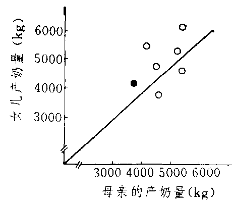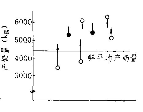 ❷垂直线法。以纵坐标表示产奶量,畜群平均产奶量用一横线表示。每对母女标以一条垂直线,母亲产奶量用圆点表示,女儿产量用箭头表示;高于母亲者箭头向上,低于母亲者箭头向下。由多数箭头的方向可看出公畜的改良效果。这种方法也简单易行,并且直观。缺点也是母女不处在相同年份里,缺少可比性,已较少使用。