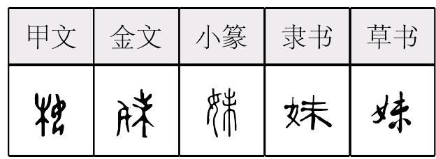 mèi形声,从女,未声,本义为同父母而年龄比自己小的女子,引申为同辈中年龄比自己小的女子。 |