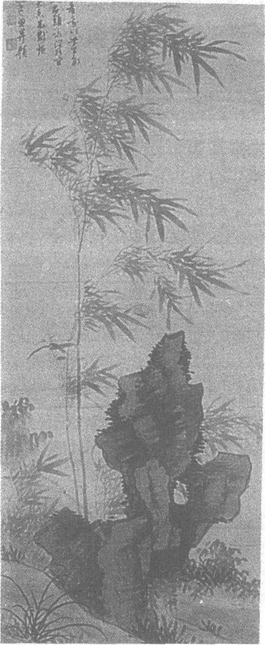 明。姚绶绘。纸本设色。纵150.5厘米,横56.7厘米。北京故宫博物院藏。姚绶(公元1422—1495年),字公绶,号丹丘生,又号谷庵子、云东逸史。浙江嘉兴人。天顺中赐进士,授监察御史,成化初为永宁郡守,能诗,善书画。书得钟、王之妙,画学王蒙、赵孟頫及吴镇,好作沙坳水曲,孤钓独吟之景,间作竹石、花鸟,墨色苍润,笔致潇洒。此图绘缓坡之上,湖石耸立,峻秀玲珑,石隙间苔藓凝露,坡冈下幽草丛生。石后,两竿细竹迎风挺立,枝叶飘舞,姿影婆娑,湖石勾勒灵活,以浓墨皴染擦点。风竹用淡青色直接写出,笔法简放,得清劲雅逸之致。图左上方自题:“今雨亦来看我竹,世间多少岁寒人。石头路阔能容步,烧笋茶香不厌频。”款署“云东逸史画并书。”下钤〈公绶〉、〈古柱下史〉二印。图中并有〈吴景州审定印〉等鉴藏印多方。