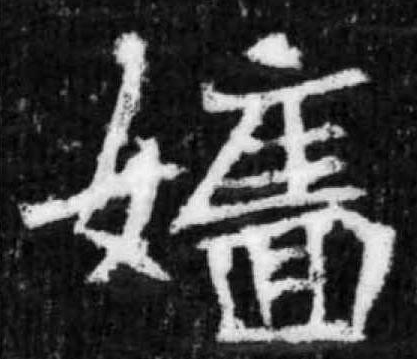 王僧男墓誌,北魏能記釋嬪嬙,接進有序。按: 廧聲,“嗇”省形。封忠簡妻王楚英墓誌,隋彤管嬪嬙,皆仰茂則。西宫二品昭儀誌銘,唐遽警嬪嬙之操。李侹妻韋氏墓誌,唐女則嬪嬙。按: 嗇聲,省形。《説文(新附)》: “嬙,婦官也。从女,牆省聲。”“嬙”,从女嗇聲,或作廧聲。古時宫中女官。
