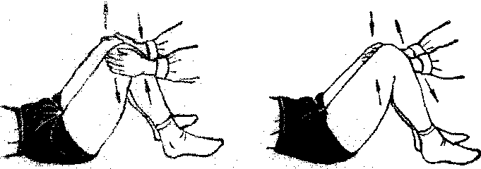 (2)髋内收及外展运动: 仰卧、屈双膝,并足,两膝内收及外展。内收时可给予阻力(见图2)。也可作模仿蛙泳的夹水动作,重复6~8次。
