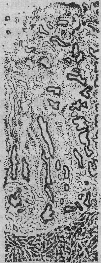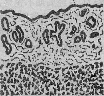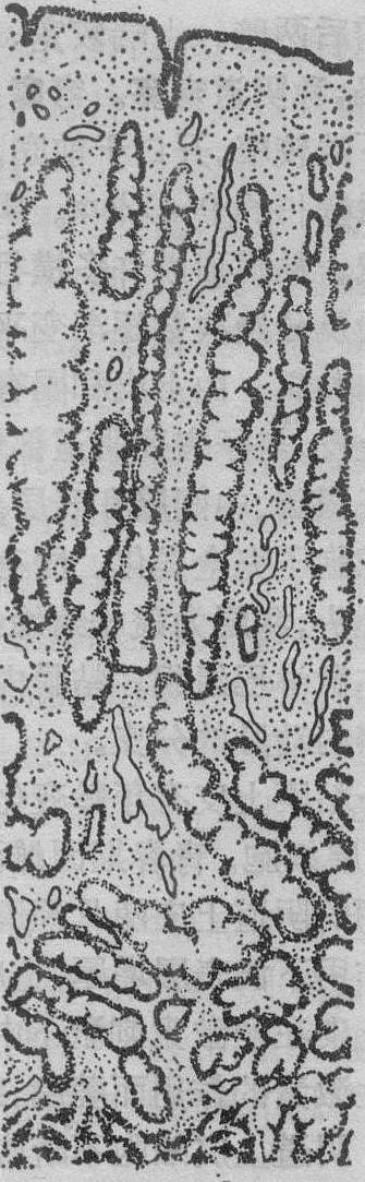 图4 子宫内膜月经期(月经周期第1天) 子宫内膜周期性变化直接受卵巢内分泌功能的控制。卵巢的周期性活动又受脑垂体前叶分泌的促性腺激素即卵泡刺激素(FSH)和黄体生成素(LH)的调节,而促性腺激素的分泌又受下丘脑分泌的促性腺激素释放激素(GRH)的调节。卵泡刺激素刺激卵巢内卵泡的生长和分泌大量雌激素,雌激素则使子宫内膜发生增生期变化。血中高浓度的雌激素通过反馈,作用于下丘脑和脑垂体,抑制卵泡刺激素和黄体生成素的分泌。在黄体生成素和卵泡刺激素的协同作用下,促使卵泡成熟、排卵及形成黄体。黄体分泌大量孕酮和雌激素,使子宫内膜发生分泌期变化。血液中孕酮升高也可作用于下丘脑和脑垂体,抑制黄体生成素的分泌,于是黄体退化。血液中孕酮及雌激素含量下降,子宫内膜脱落出血而入月经期。月经期后,在下丘脑和脑垂体分泌激素的影响下,开始另一个卵巢周期和月经周期的变化。 ☚ 子宫 子宫颈 ☛ |