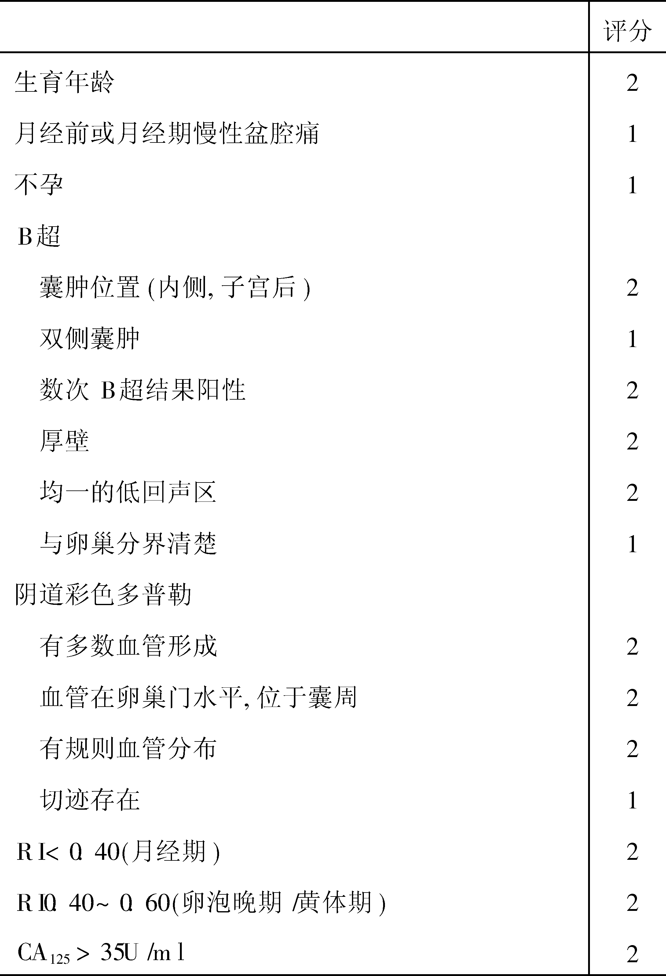 Kurjak等一项5年的回顾性研究中,将临床症状、体征、血清CA125、B超和阴道彩色多普勒超声结合研制一评分系统(见下表),由于微小和轻度子宫内膜异位症病变在盆腔超声下无法发现,因此,腹膜种植异位灶未列入该表中。彩色超声多普勒发现子宫内膜异位症的患者血流阻力指数(resistant index, RI)随月经周期改变而变化,经期RI降低,非经期增高,有异位瘤的患者可发现子宫肌层内的小动脉切迹。诊断子宫内膜异位症的判断标准范围在20~25分之间。