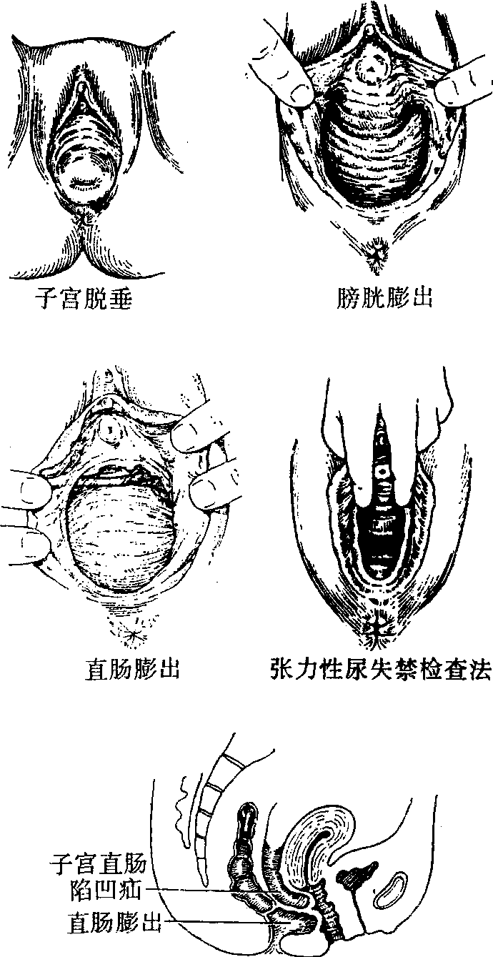 | 释义 | 子宫脱垂与阴道前后壁膨出的病因及表现 子宫脱垂与阴道前后壁膨出的病因及表现支持子宫正常位置的韧带、筋膜、肌肉受到损伤,或过度松弛,尤其后位子宫,子宫轴与阴道轴相一致,在腹压增加的影响下,子宫即沿阴道方向向下脱出,导致子宫脱垂(见图7.6-1)。同样,影响盆底组织功能的恢复,使阴道前壁膨出(膀胱膨出)及阴道后壁膨出(直肠膨出)。过去子宫脱垂发生的主要原因是产伤。分娩时子宫口尚未开全产妇即向下屏气用力,急产、滞产、巨大胎儿,困难的阴道手术产,都能使子宫的支持组织及盆底组织伸展或撕裂。如未及时修补,产后又未注意休息,甚至参加重体力劳动,就直接影响其功能的恢复,为子宫脱垂创造了条件;而绝经期后妇女发生子宫脱垂或有些产后轻度脱垂,而到更年期或绝经期后脱垂程度加重。这是因为卵巢功能衰退,雌激素水平低落,生殖器官萎缩,组织缺乏弹性,使子宫各韧带及盆底组织变得薄弱、松弛无力;腹内压力增加,也是病因,如慢性咳嗽,习惯性便秘,慢性腹泻或长期从事蹲、站立、肩挑或搬举重物的体力劳动,也有因腹水等因素使腹内压力增加,使子宫脱垂。发生子宫脱垂后,病人感腰酸、下坠感,有肿物脱出阴道外。最初于用力时脱出,休息、卧床后能自动回缩。发展下去,肿物越来越大,必须用手还纳入阴道,严重时脱物充血、水肿、肥大,甚至无法还纳,长期暴露于阴道口外。因长期摩擦而发生糜烂、溃疡、感染,渗出脓性分泌物,病人行动不便,痛苦异常。伴发阴道前壁膨出(膀胱膨出)者,可发生排尿困难,尿潴留,有尿道膨出时,可发生压力性尿失禁,在大笑、咳嗽、用力等增加压力的情况下,有尿液逸出。有阴道后壁膨出(直肠膨出)者,可有排便困难。