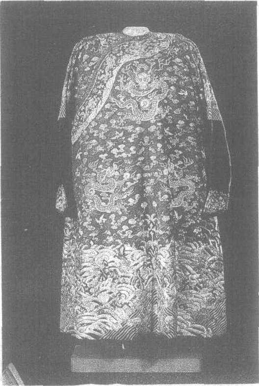 | 释义 | 孔雀羽彩绣云龙吉服袍 孔雀羽彩绣云龙吉服袍清。身长143厘米,两袖通长216厘米,胸围134厘米,下摆宽124厘米,开裾长79.5厘米。北京故宫博物院藏。这是一件乾隆时期按宫廷服式定制的裌袍,圆领、右衽、大襟、马蹄袖,左右开裾直身。以蓝色素缎作袍面,领袖俱用石青片金缘。花纹分布严密有序:在前胸和后背及两肩各绣正龙一,前后襟绣行龙四,底襟绣行龙一,共绣9条大龙。又在两袖头绣小正龙各一,领袖小正龙二,行龙四。龙纹是封建皇族专用的服装纹样,在清代宫廷帝王冠服格式中,此袍式定为“吉服袍”。此袍九条龙纹间点缀各种吉祥纹饰,如五色彩云、蝙蝠,寓意洪福齐天;八种佛教的法器:轮、螺、伞、盖、花、罐、鱼、肠,寓意八吉祥;八仙人持八件器物:张果老的渔鼓,吕洞宾的宝剑,蓝采和的花篮,汉钟离的扇,韩湘子的笛,何仙姑的荷花,铁拐李的葫芦,曹国舅的板,八件器物合称暗八仙;折枝桃、石榴、佛手,寓意多福、多寿、多子;在前后襟下幅部位,绣有平列式的潮水和直立式水纹、寿山纹,中间散织有金锭、银锭、珍珠、犀角、如意、方胜、珊瑚、金钱八宝纹;此袍全身用孔雀羽线、米珠、珊瑚珠、捻金银丝和五彩丝,运用钉线、套针、齐针、打子、滚针、钉金银线等传统织绣技巧织成,构图匀称,主次分明,用色丰富,配色熟练准确,洁静高雅,使此袍显得五彩缤纷,光泽耀目,豪华富丽。