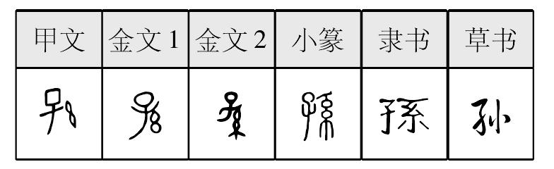 sūn表意,甲骨文、金文1从子从幺,金文2从子从糸,小篆从子从系,隶定为“孫”。幺、糸、系都有连绵不绝义,子之子为孫,世代相延,故本义表示儿子的儿子。(一说本义表示子的后续或后代。)引申为和孙子同辈的亲属、孙子以后的各代、再生或孳生的(植物)等。汉代俗字、《简体字表》、《简化字表》简作“孙”,表意,从子从小。 【辨析】 ❶以“孙”作音符构成的形声字一般韵母为un,但声调和声母不同。sūn:狲、荪∣xùn:逊。 ❷“孙(孫)”可作类推简化偏旁使用,如:逊(遜)、狲(猻)、荪(蓀)。孙 孫; 甲 金 篆 隶sūn【析形】会意字。甲骨文、金文字形从子,从糸(mì),表示后代繁衍连绵不绝。小篆字形糸旁变为系旁。 【释义】《说文》:“子之子曰孙。”本义是儿子的子女。现在通常把女儿的子女称为外孙,需要区别时,有时也把儿子的子女称为内孙;又可泛指后代子孙。在中国传统文化中,非常重视家族世系与后代延续。《尔雅·释亲》:“子之子为孙,孙之子为曾孙,曾孙之子为玄孙,玄孙之子为来孙,来孙之子为晜孙,晜孙之子为仍孙,仍孙之子为云孙。”孙、曾孙、玄孙、来孙、晜孙、仍孙、云孙称为[七世子孙]。儿孙绵延是家族兴旺的标志,故有[含饴弄孙](含着饴糖逗小孙子)形容老人自娱晚年,不问他事的乐趣;强调子孙的孝顺,故有[孝子贤孙](对父母先人孝顺的儿孙后辈)。 【shape analysis】It is the associative character.In Oracle and Bronze Inscriptions,the meaningful parts are子(zǐ,son)and糸(mì),referring to the endless generations reproduction.In Small Seal script糸(mì)has been changed to系. 【original meaning】The son's sons and daughters. |