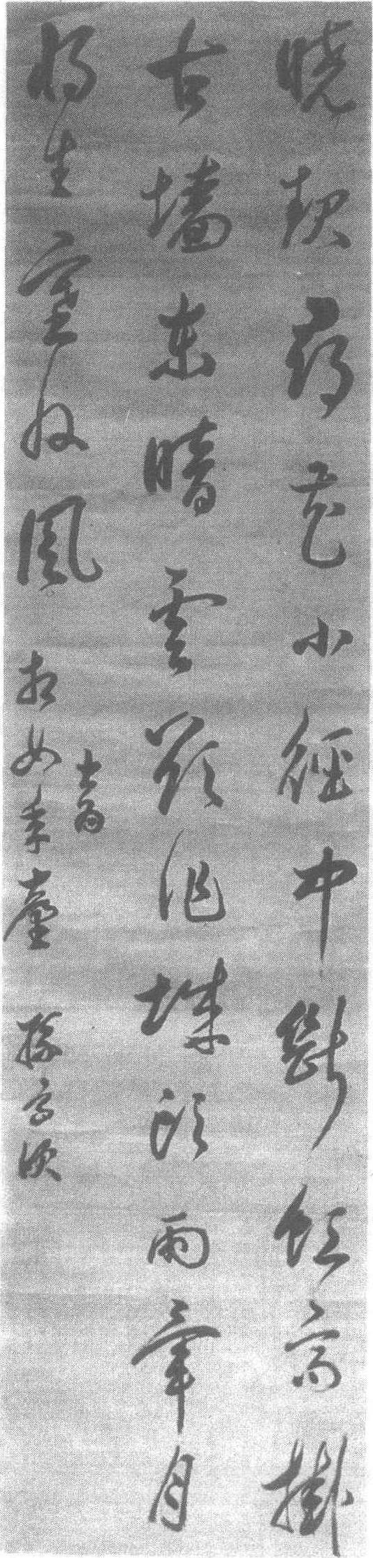 清。绫本。纵192厘米,横47厘米。四川省重庆市博物馆藏。孙岳颁(明崇祯十二年—清嘉庆十三年,即公元1639年—1708年),字云韶,号树峰,吴县(今江苏苏州)人。康熙二十一年进士,官至礼部侍郎。工书,法从董其昌,得清康熙帝赏识,每有御制碑版则必命其书之,康熙曾以“笔端垂露”四字赐之。此七言绝句:“晓起寻花小径中,断虹高挂古墙东,暗云欲作城头雨,晕月将生塞外风。”下款署:“书为相如年台孙岳颁。”此篇行草用笔钝中有锐,寓巧于拙,笔力圆劲苍清,字体方圆兼备,笔势流畅灵动,有气脉贯通,一气呵成之势,是孙岳颁的精心之作,并再现了董其昌的书风。