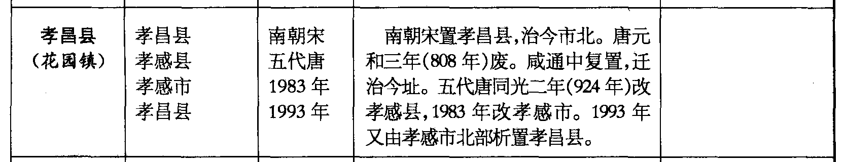 孝昌县(花园镇)孝昌县孝感县孝感市孝昌县南朝宋五代唐1983年1993年南朝宋置孝昌县,治今市北。唐元和三年(808年)废。咸通中复置,迁治今址。五代唐同光二年(924年)改孝感县,1983年改孝感市。1993年又由孝感市北部析置孝昌县。